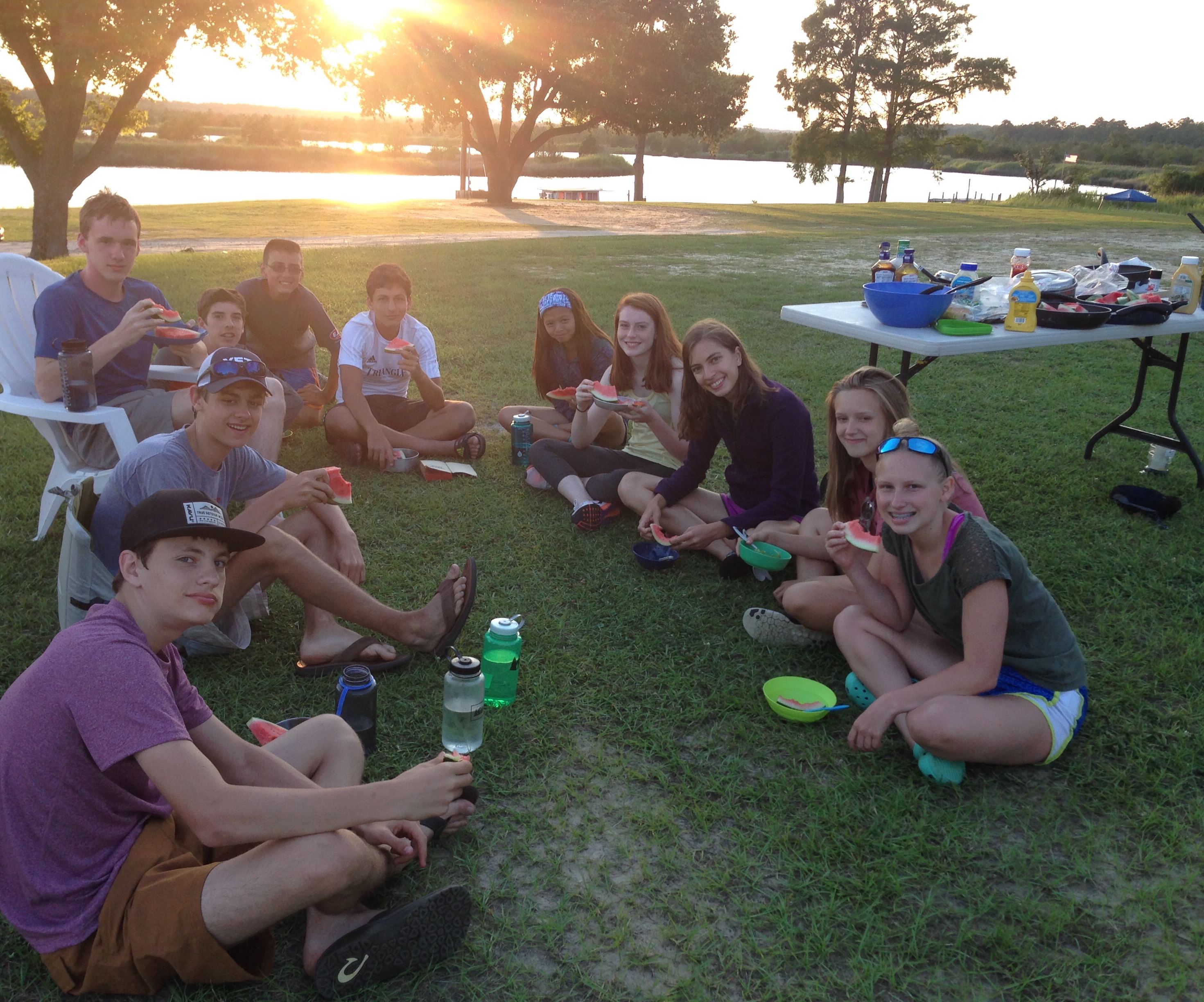 Dinner was a smorgasbord of hamburgers and hotdogs. After dinner, the group moved into relaxing and watching sunset. The group also celebrated the first day of summer by looking at the strawberry moon.