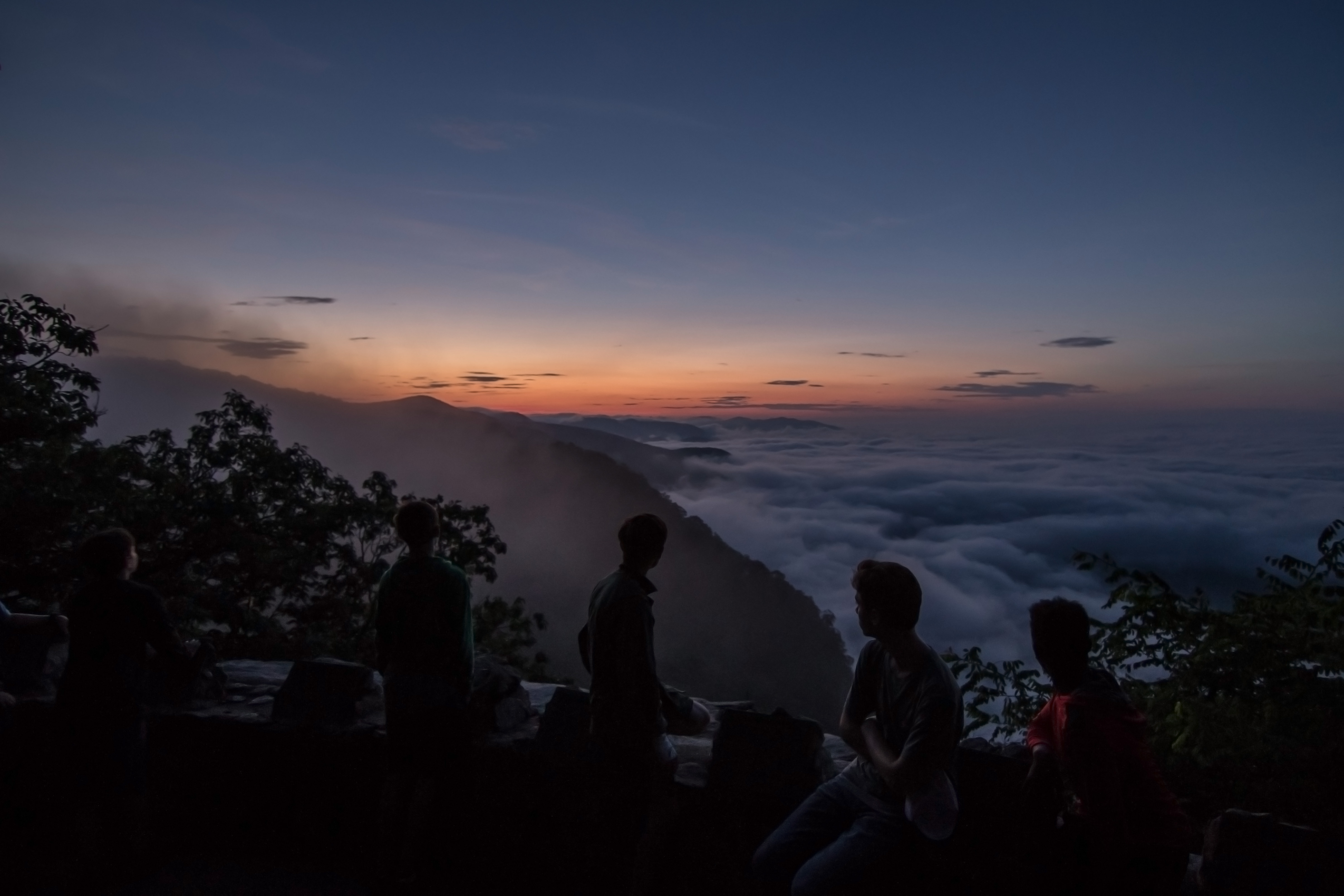 While most of Western NC was still asleep, we were getting out of bed and into our hiking shoes. This morning, after all, was the Pretty Place Pilgrimage of 2018. Our hike groups arrived to quite the spectacle, with a cobalt and vermilion sky beyond a mountainous landscape, blanketed by clouds. We drank in the peaceful mountain air, nearly silent until the sun broke the horizon. With the dawn, our Music Director, Jonathan, played a tranquil tune on his flute, after which, we all sang win-de-ya-ho to welcome the day. It’s a long hike, that can be tough in the darkness, but the reward is priceless and completely worth the work.