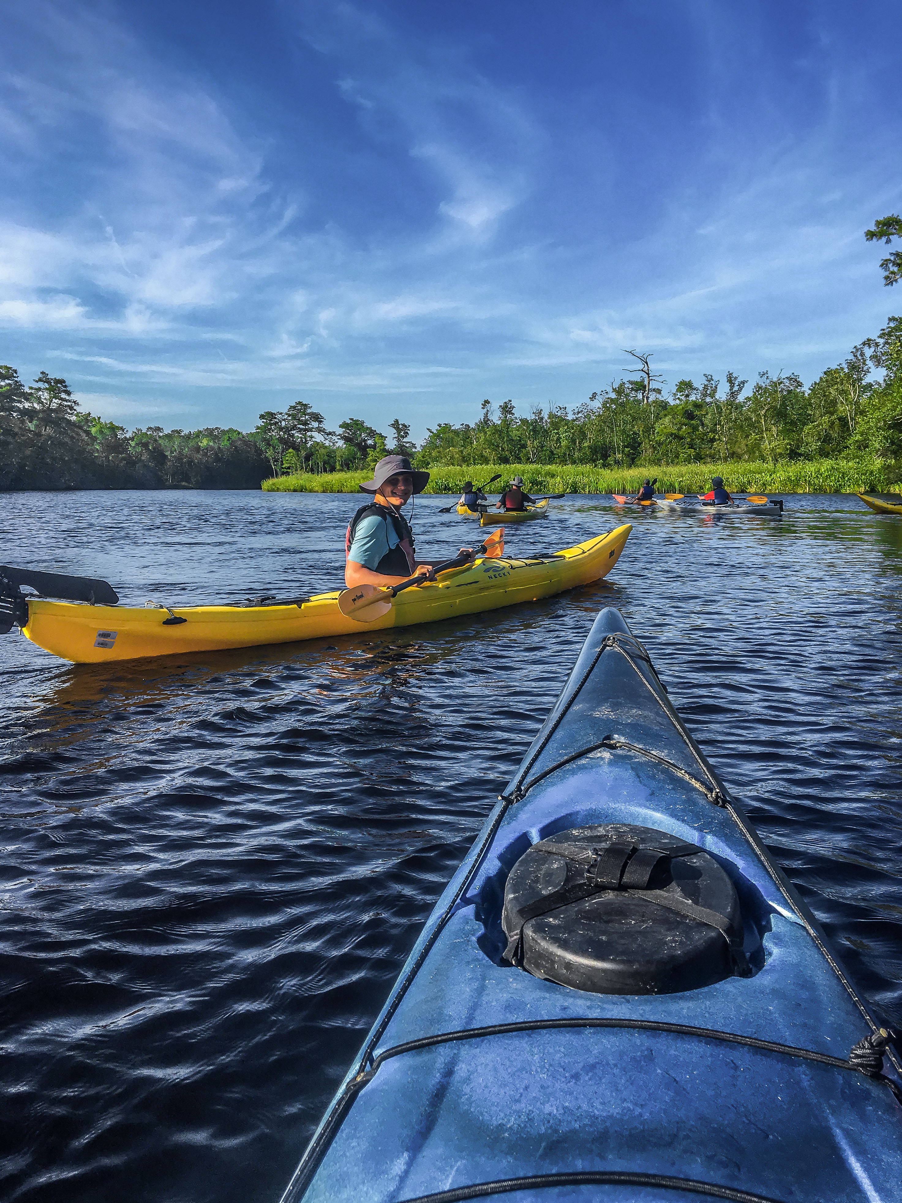 For me, my most memorable experiences on these expeditions are the sunrise paddles we do. At the end of the first week of our expedition we head just down the road from our basecamp on the White Oak River to a campground in the Croatan National Forest, which is also on the White Oak River. We arrive around midday with pre-packed lunches and a delicious dinner planned. We set up our tents at our campsite after a quick bite and head out for a mid-afternoon paddle upstream from the campsite.