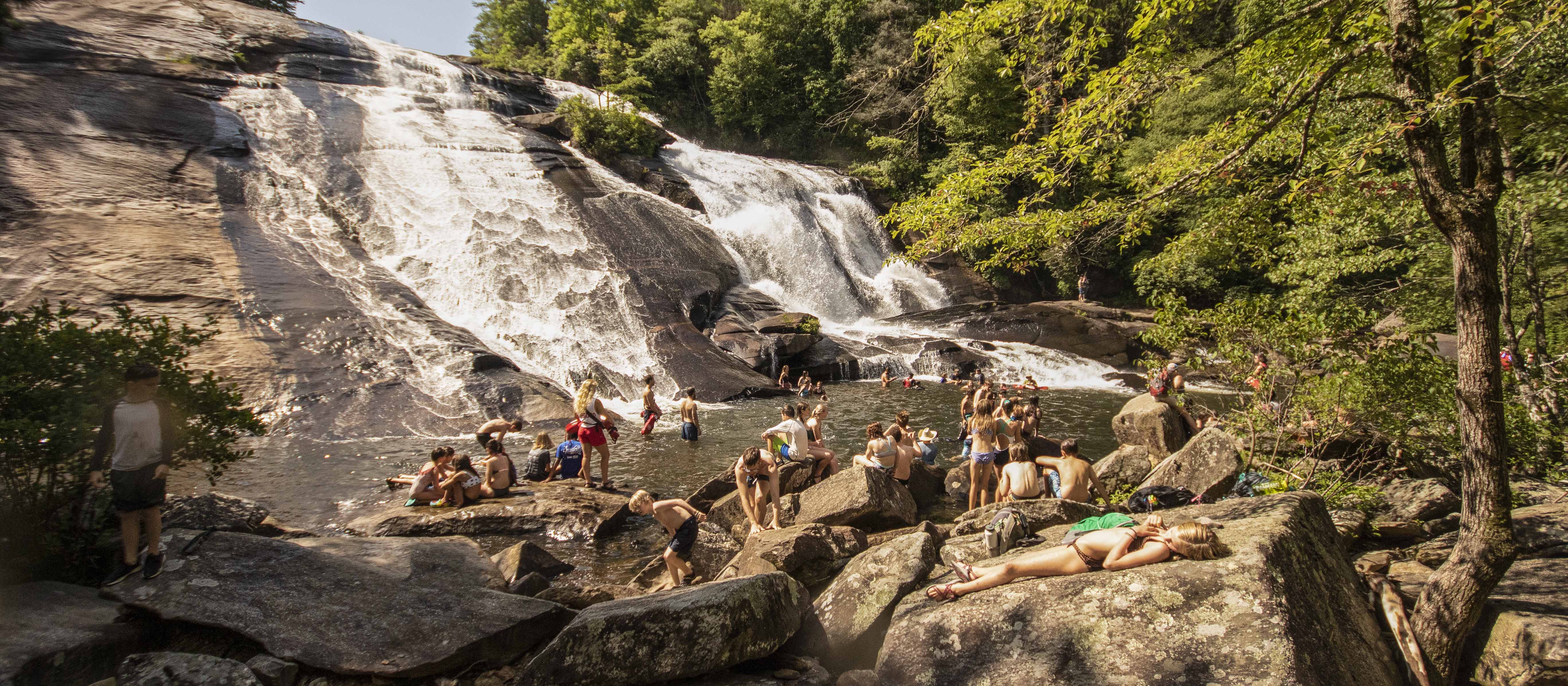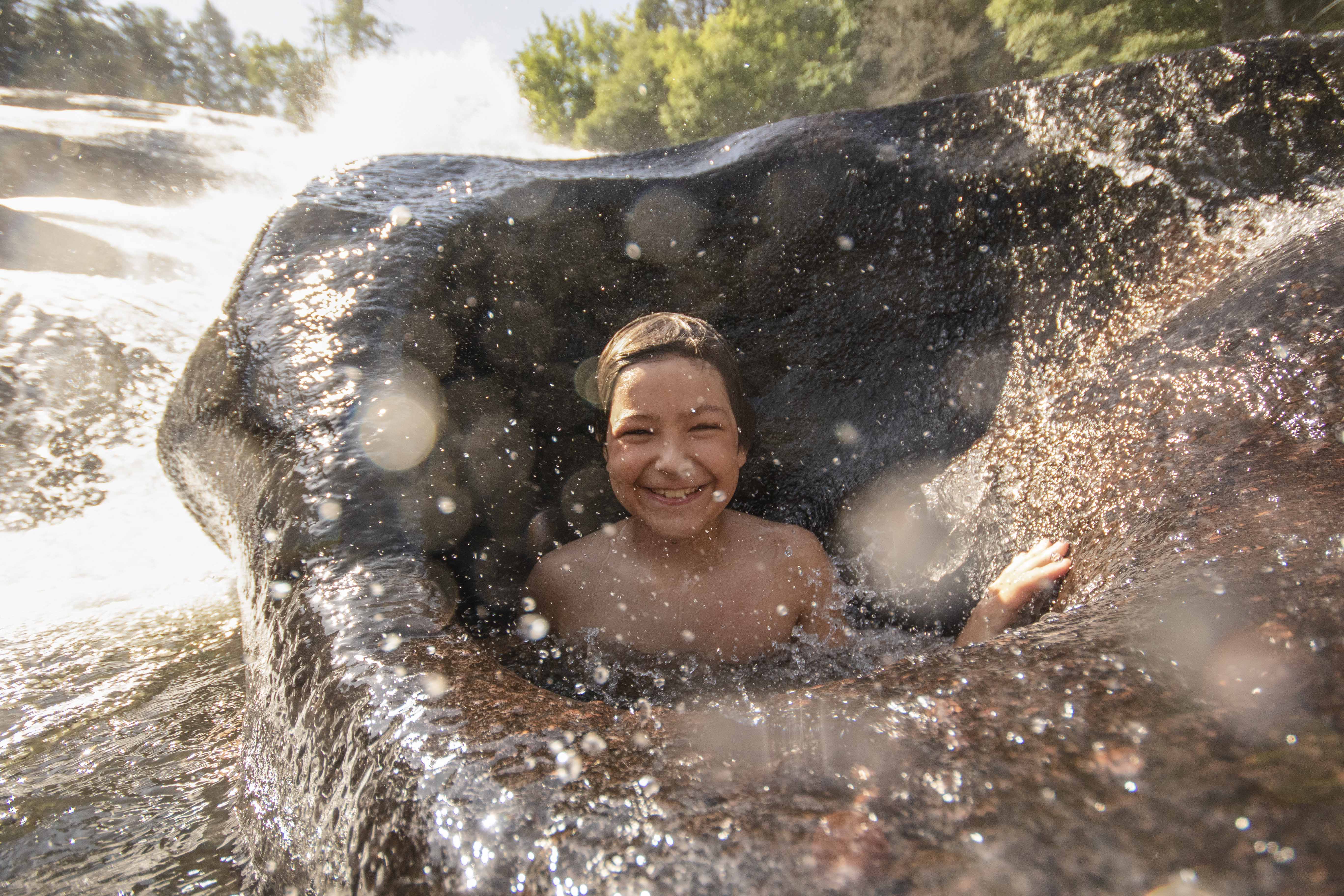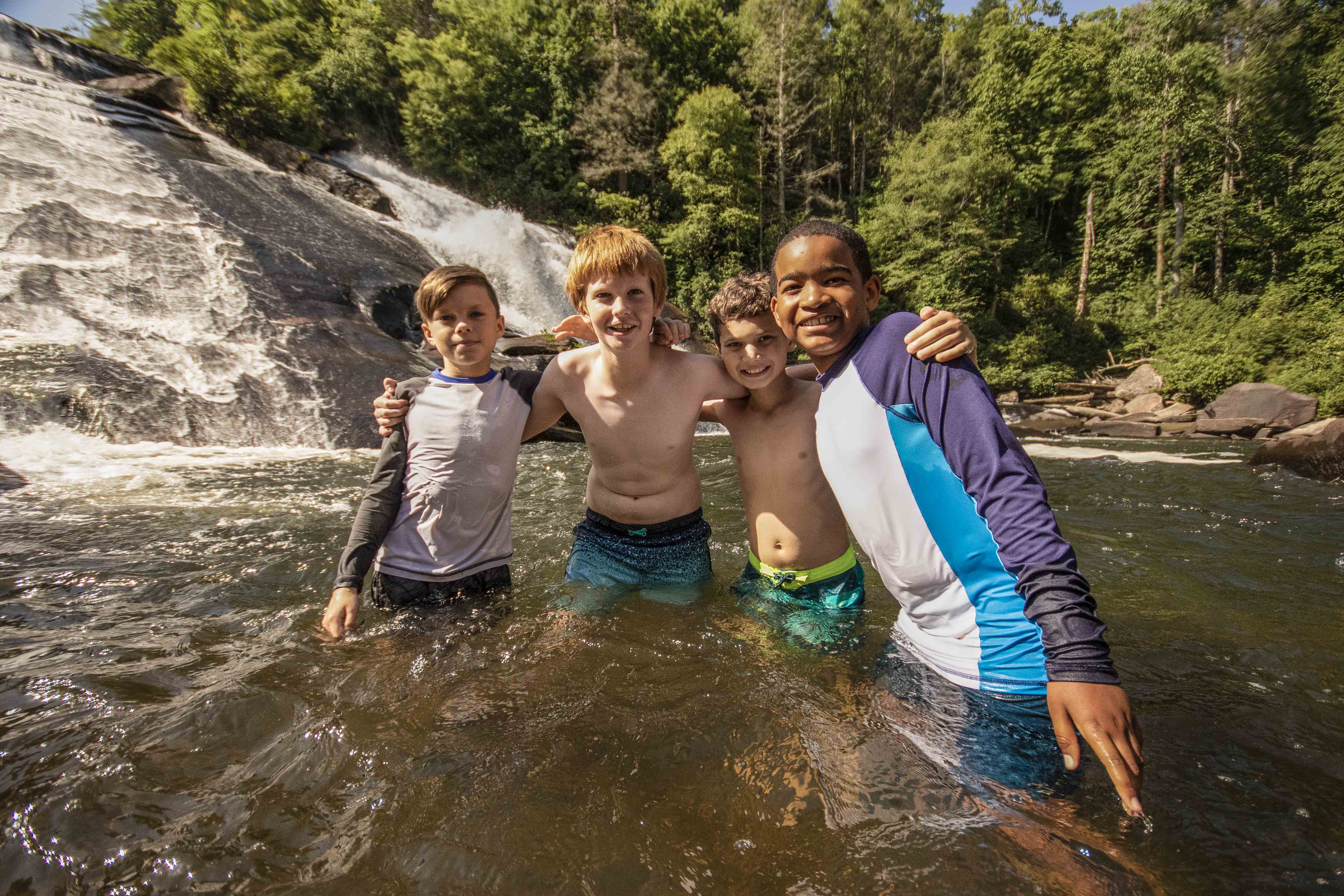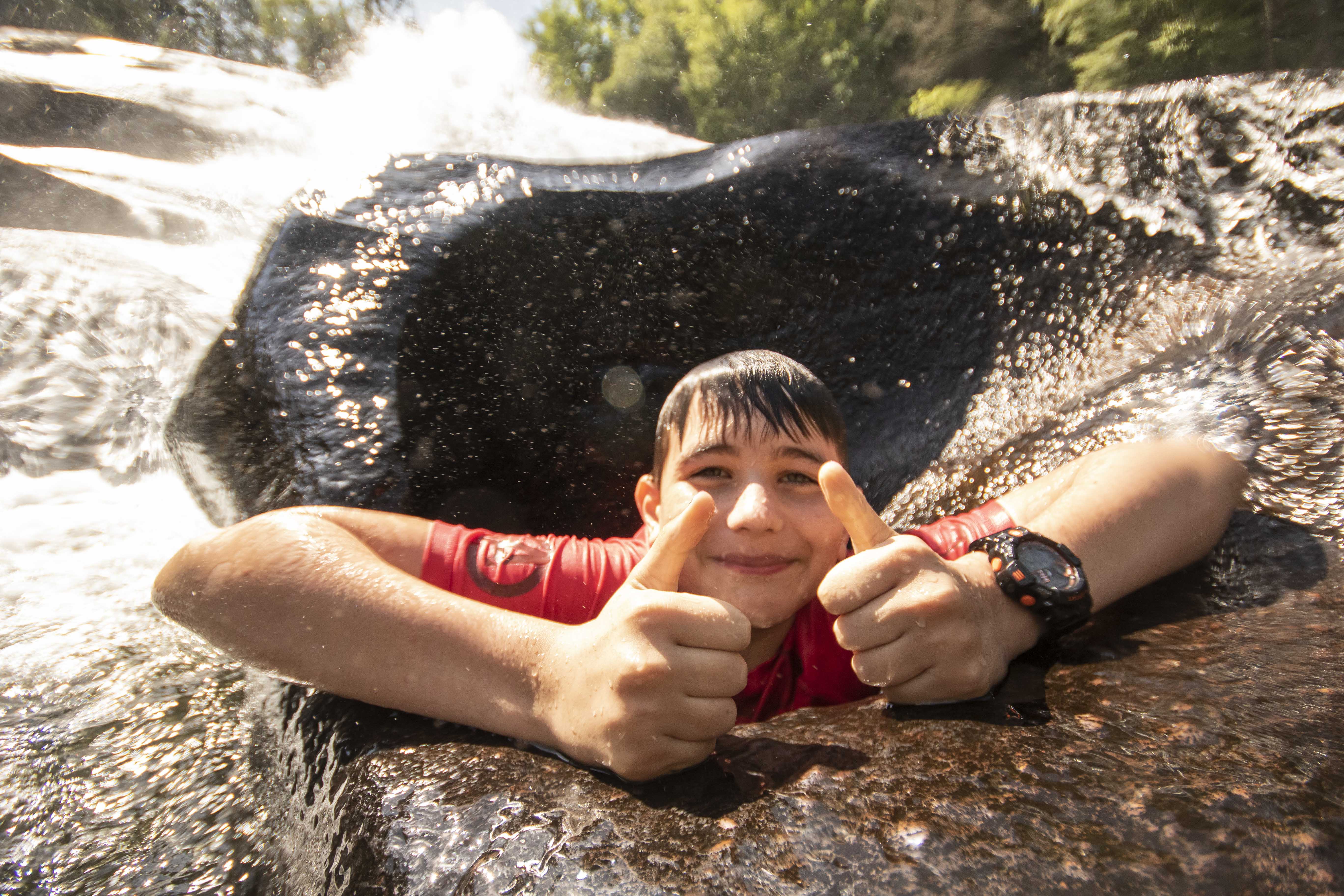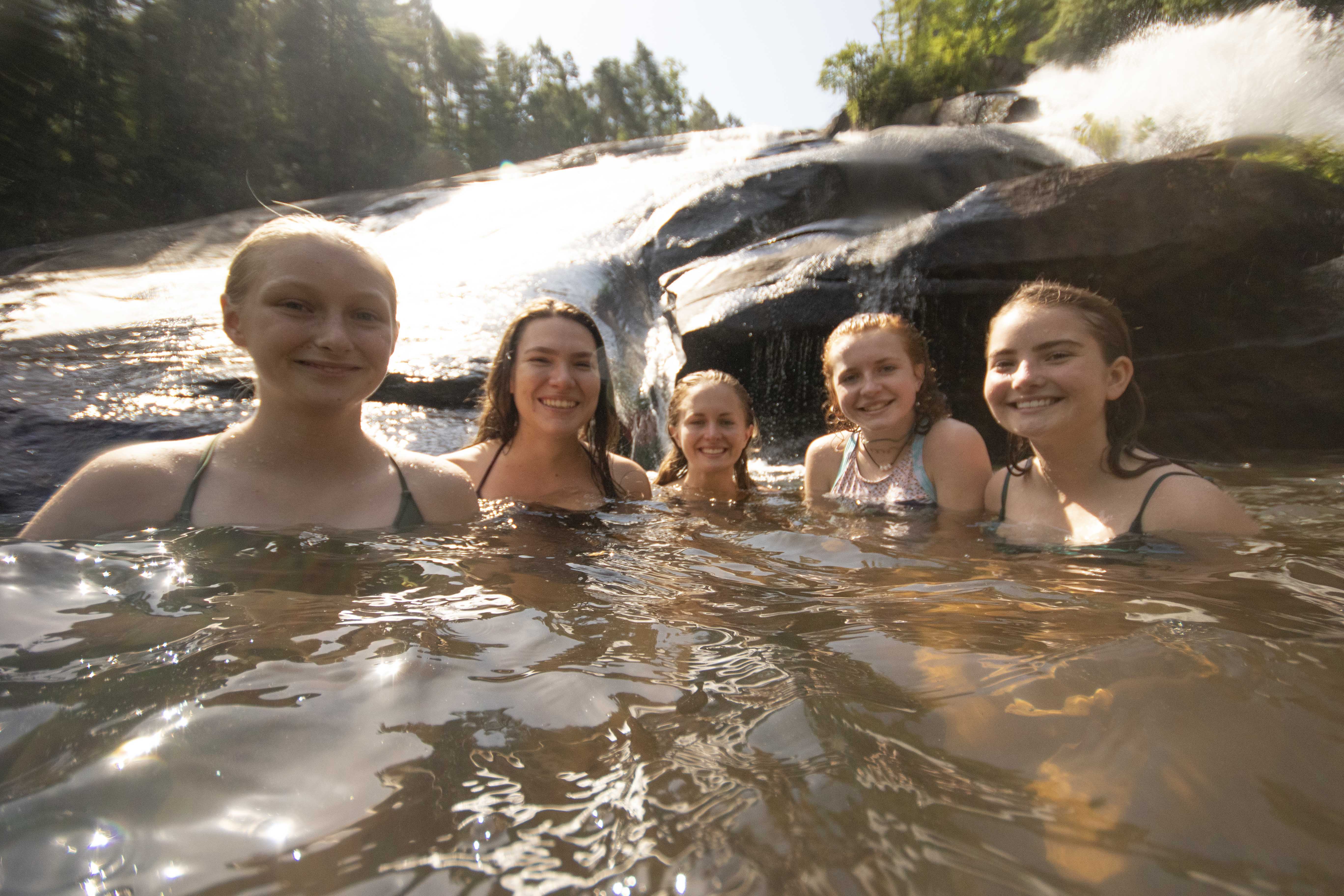 It’s Part I of DuPont Day! This means that earlier today, half of camp loaded up onto a couple of buses to venture into DuPont State Forest, while the other half of camp will get a chance to go tomorrow. We hiked for a short time, then took over the swimming hole at the bottom of the 120-foot cascade of High Falls. It’s always a mystery what awaits, when we arrive. Will it be packed with other friends and families enjoying the falls? Not this time. Today, we had the whole place to ourselves, out of sheer luck and the fact that we got there at 10:00 am on a Monday. The water level was perfect for getting right into the flow at the base of the falls, so we laughed and played for a while, then our lifeguards gave the signal for departure.