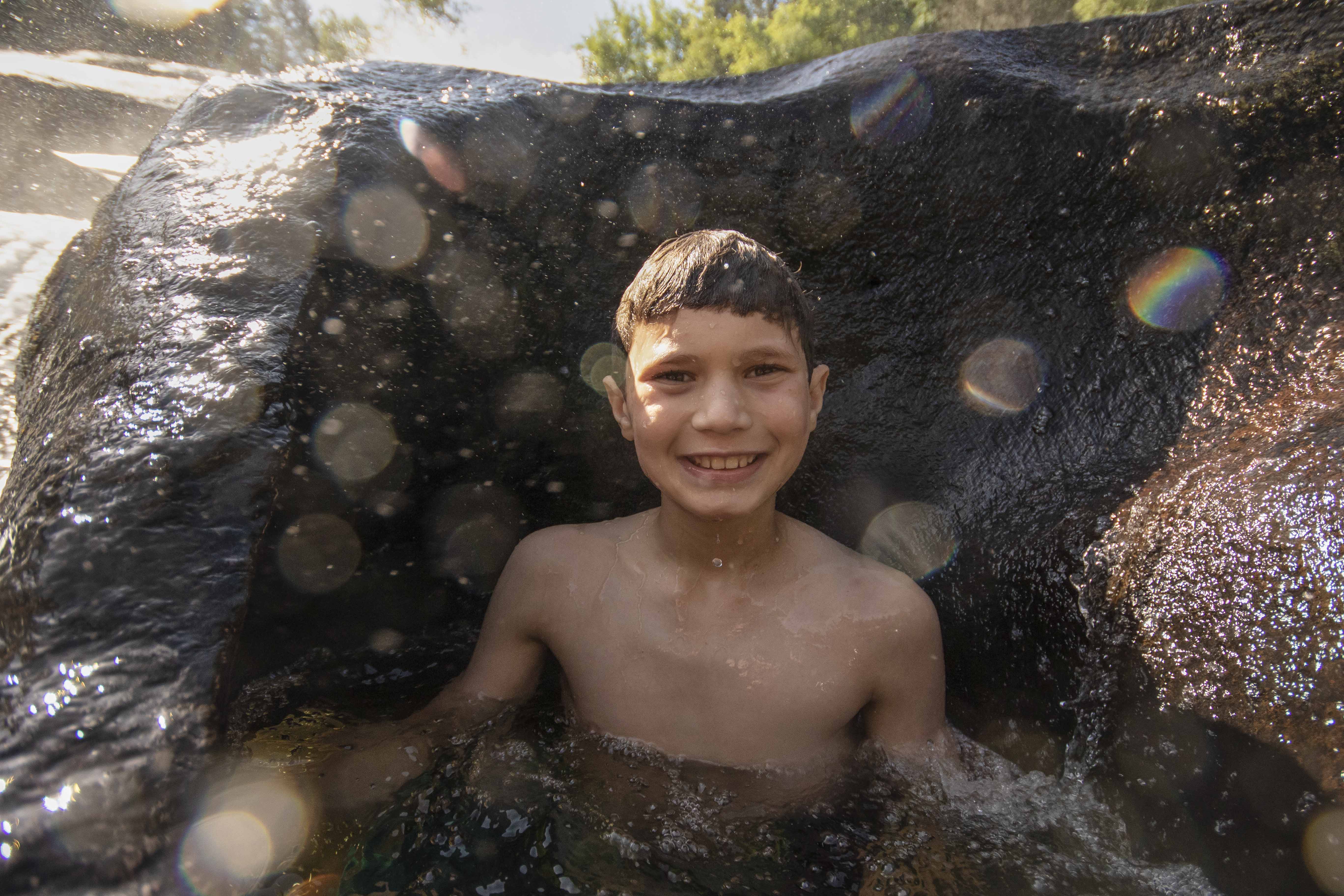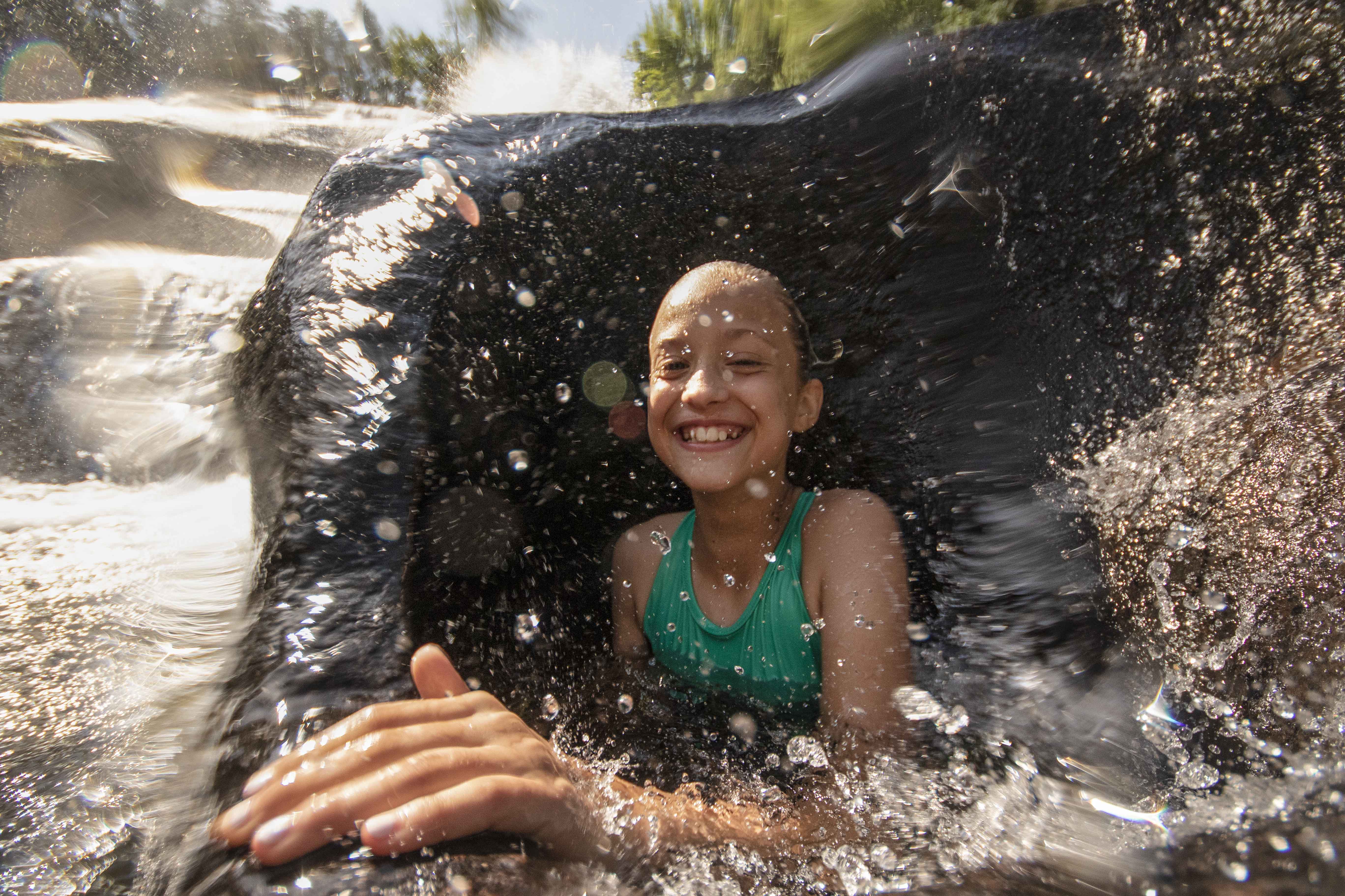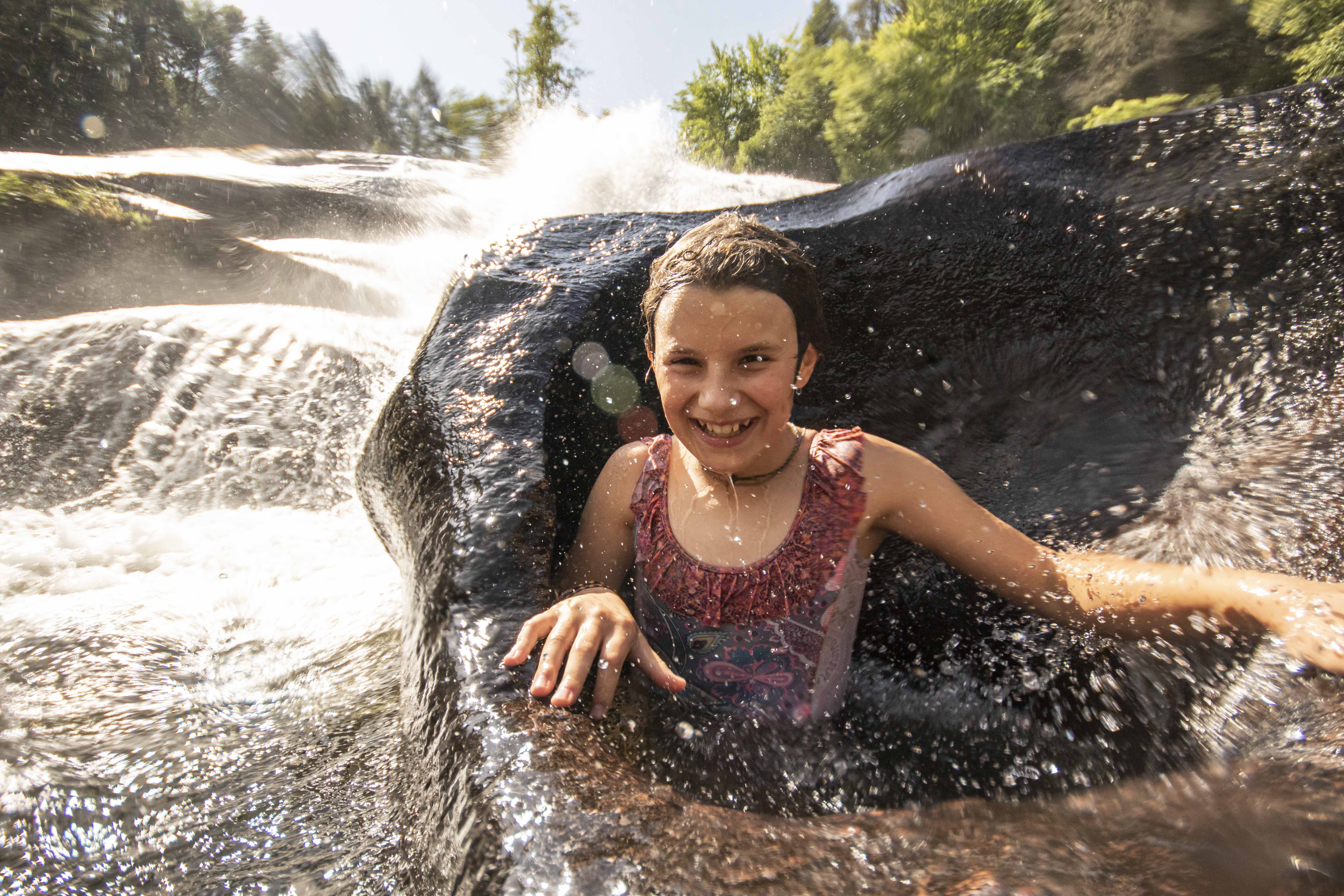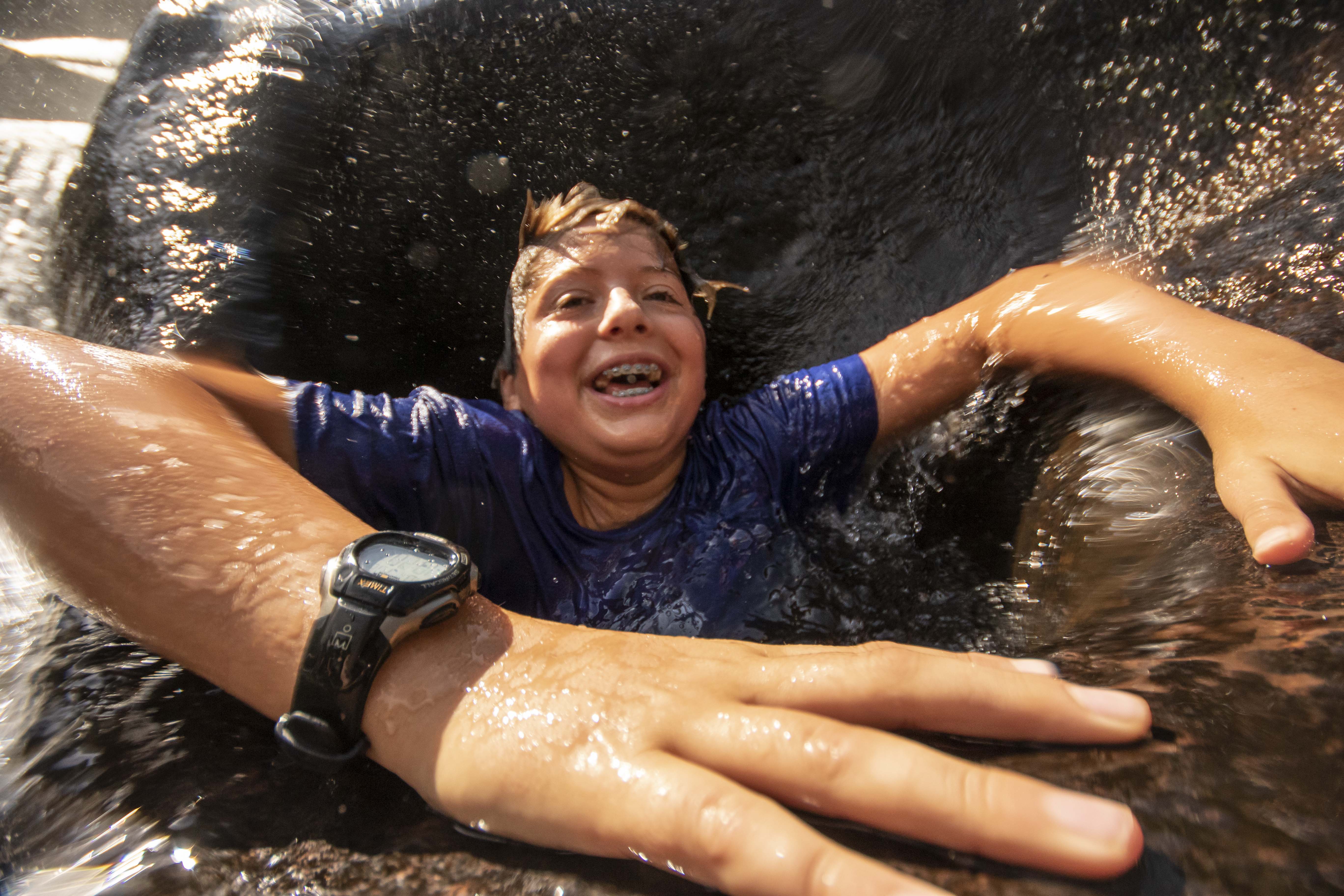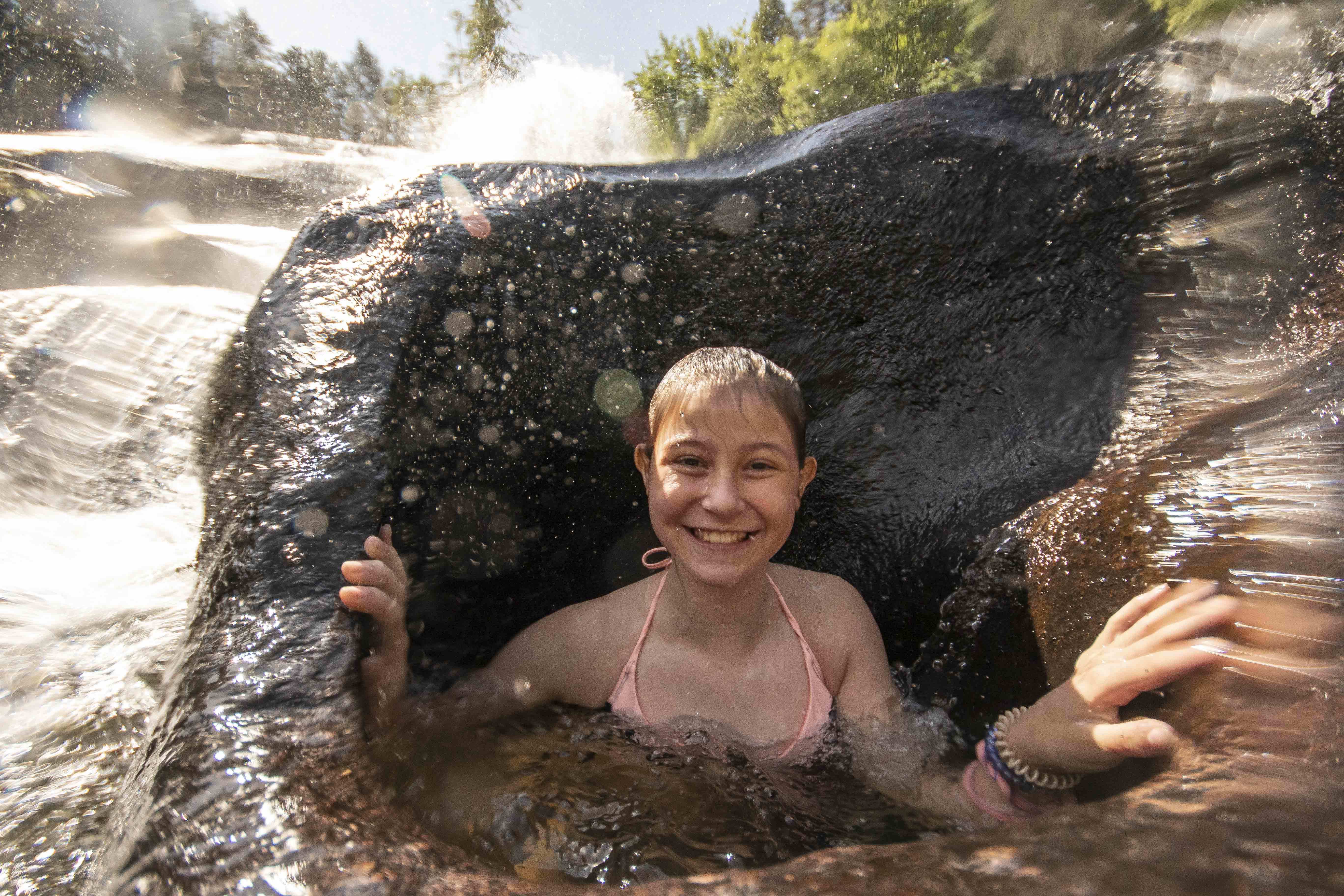 It’s Part I of DuPont Day! This means that earlier today, half of camp loaded up onto a couple of buses to venture into DuPont State Forest, while the other half of camp will get a chance to go tomorrow. We hiked for a short time, then took over the swimming hole at the bottom of the 120-foot cascade of High Falls. It’s always a mystery what awaits, when we arrive. Will it be packed with other friends and families enjoying the falls? Not this time. Today, we had the whole place to ourselves, out of sheer luck and the fact that we got there at 10:00 am on a Monday. The water level was perfect for getting right into the flow at the base of the falls, so we laughed and played for a while, then our lifeguards gave the signal for departure.