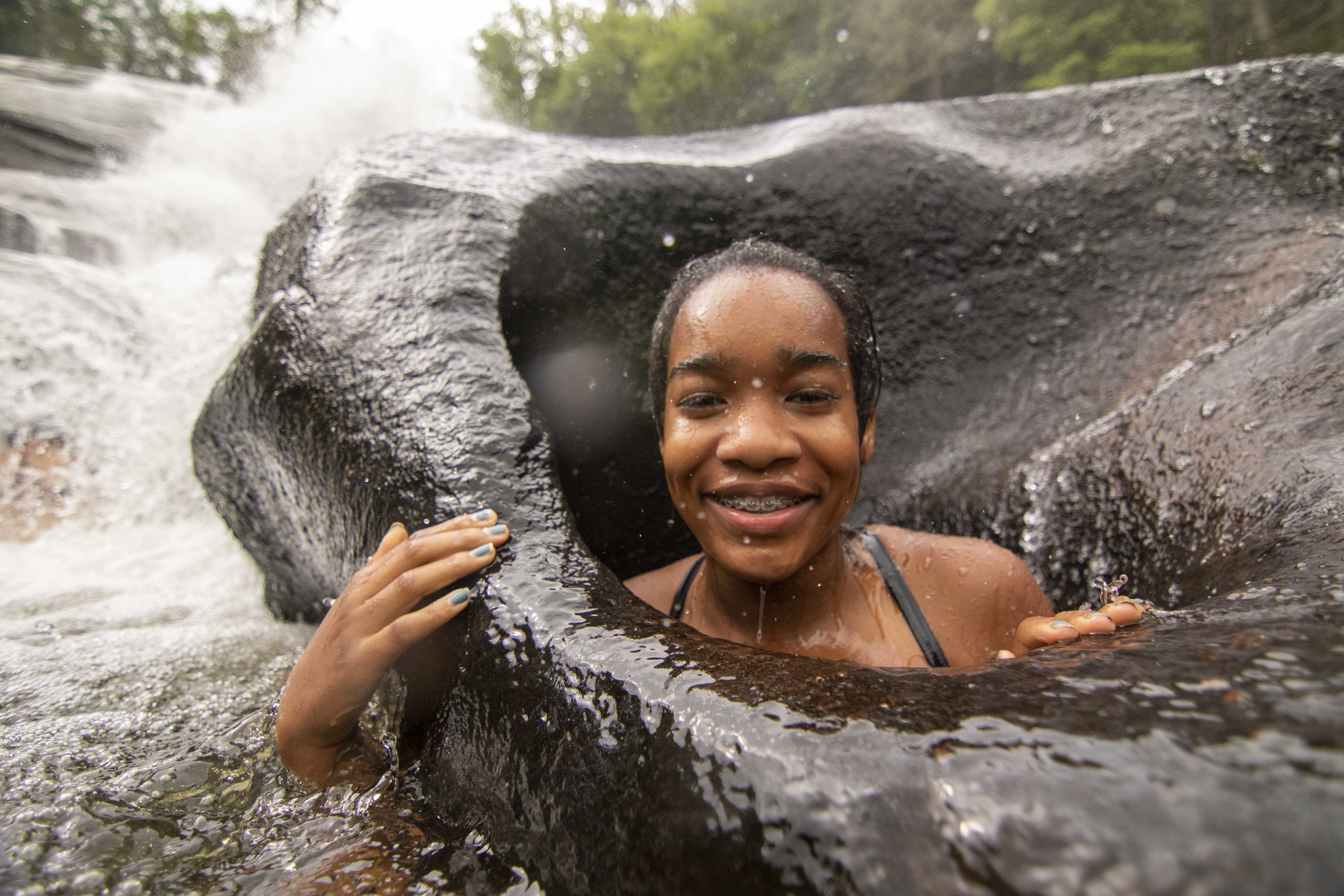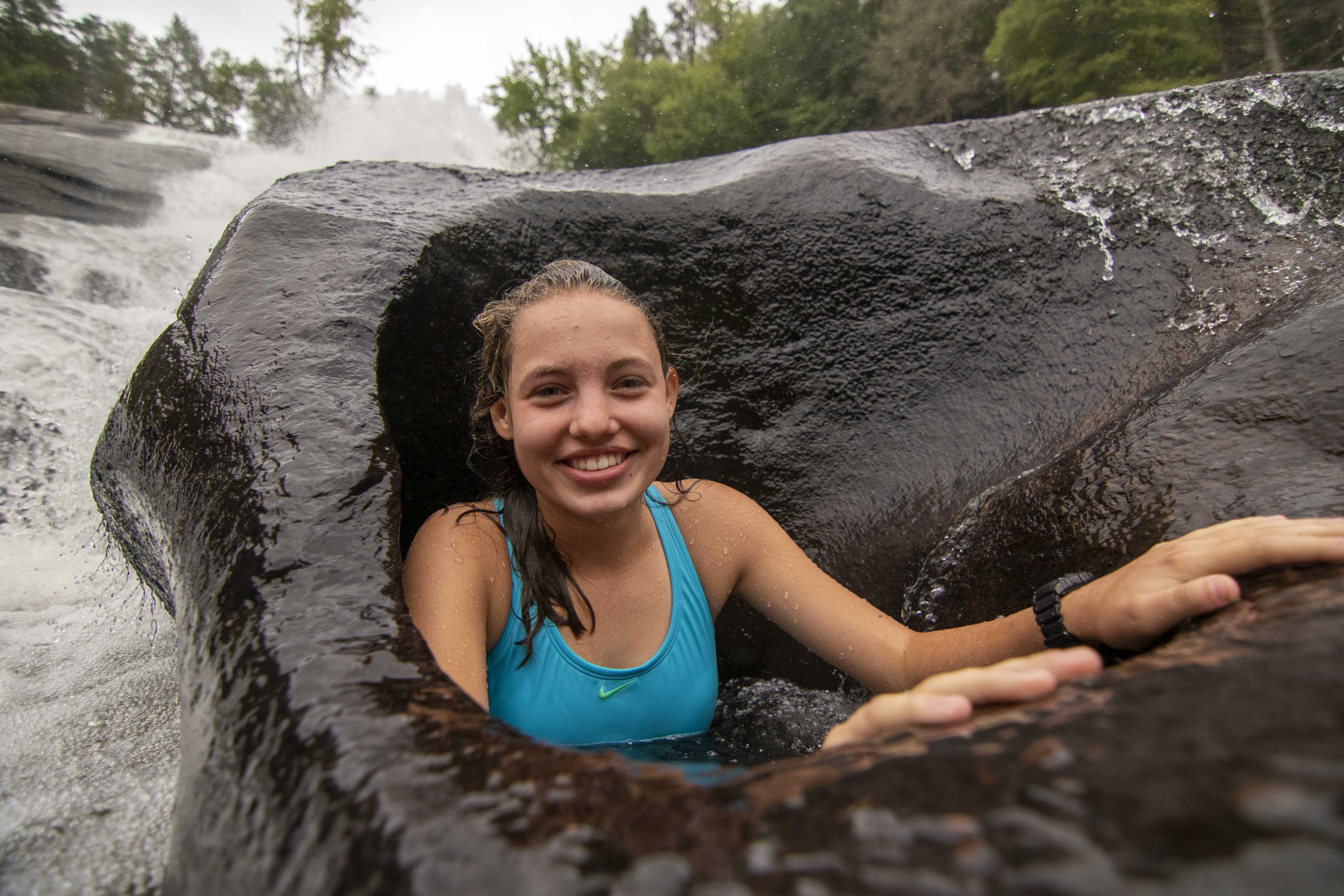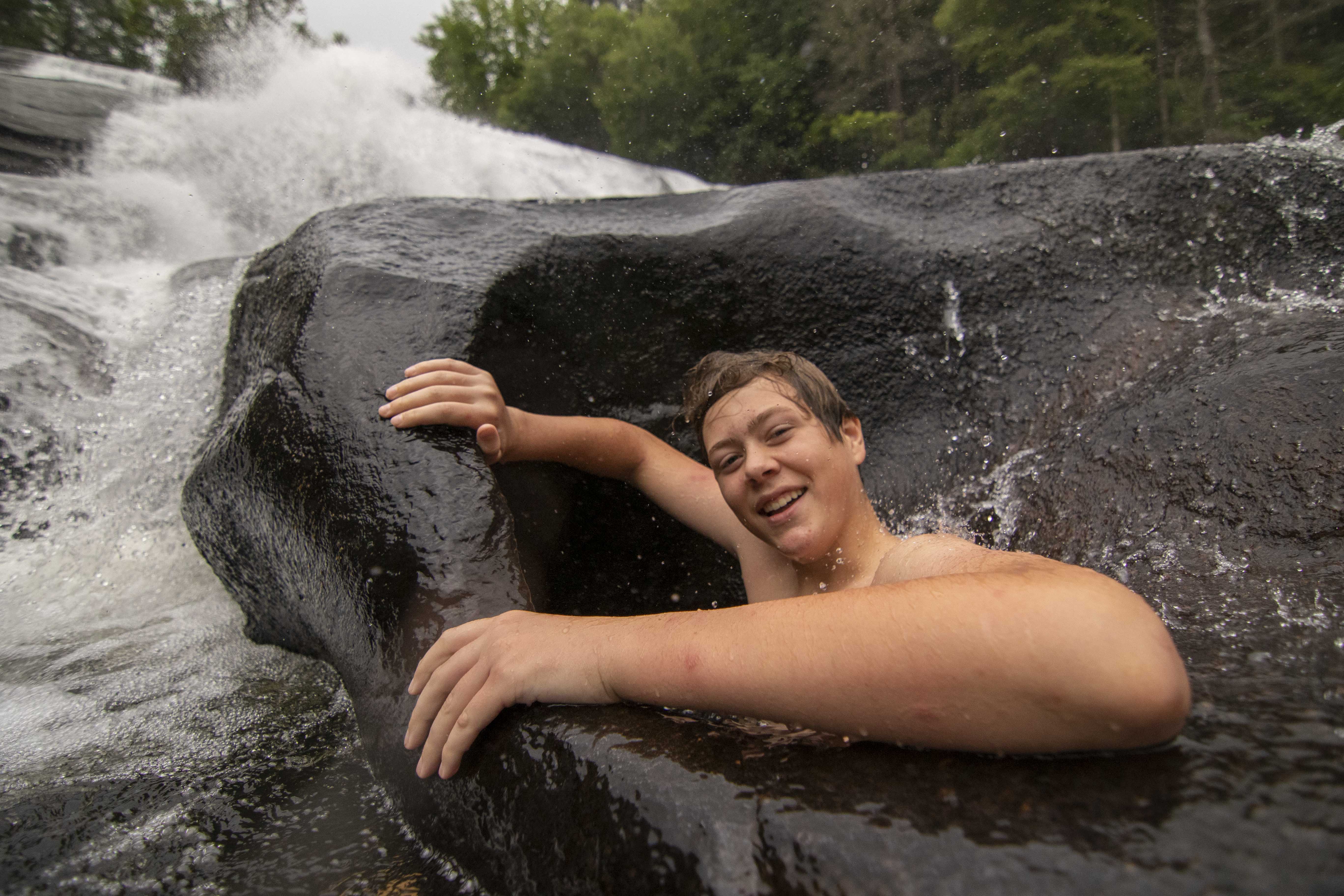 It happens all around camp, every day. We try new foods at meals, taking a tiny portion of an unfamiliar dish or carefully selecting a singular brussel sprout. We zoom off the zipline for the first time. We get blindfolded during Low Ropes and make our way through the woods. We perform in the Variety Show or at Coffee House, taking the stage for what may be the first time. And on Campout, one group surpassed an easier hike in favor of a greater challenge: scaling the Balds with packs on. Today, in DuPont State Forest, campers had the opportunity to jump into a swimming hole at the base of High Falls. There were even a handful of campers that crawled under and into a hole(formed by many years of water flow) to pose for a fun photo-op. Consistent in each of these moments is the encouragement–every performer leaves the stage to enthusiastic cheers, Low Ropes participants keep one another motivated, and the Campout group helped one another up Lower Bald with enthusiastic cheers and applause. For many campers, GRP is the place to try something new because they know they’ll have plenty of help along the way.