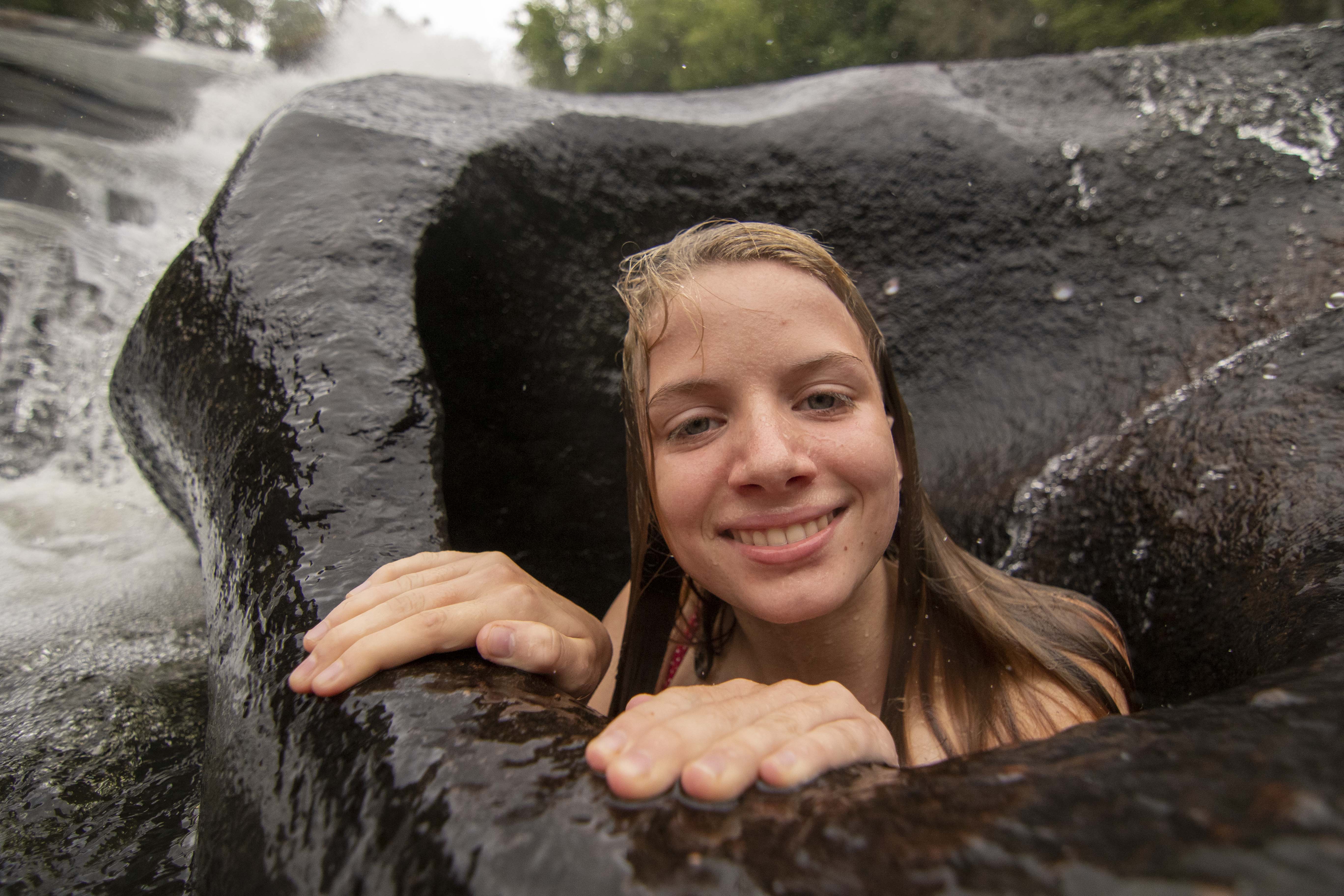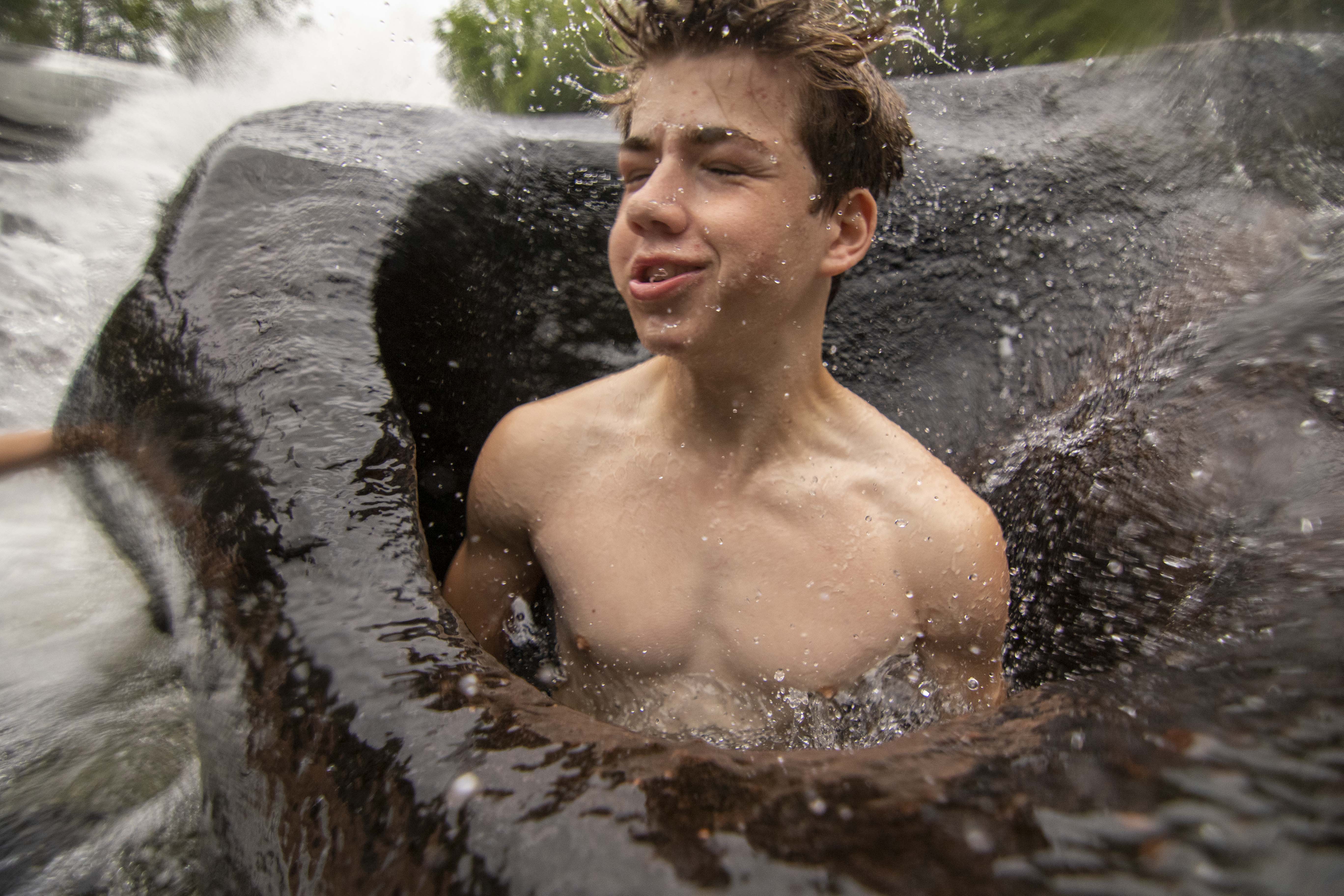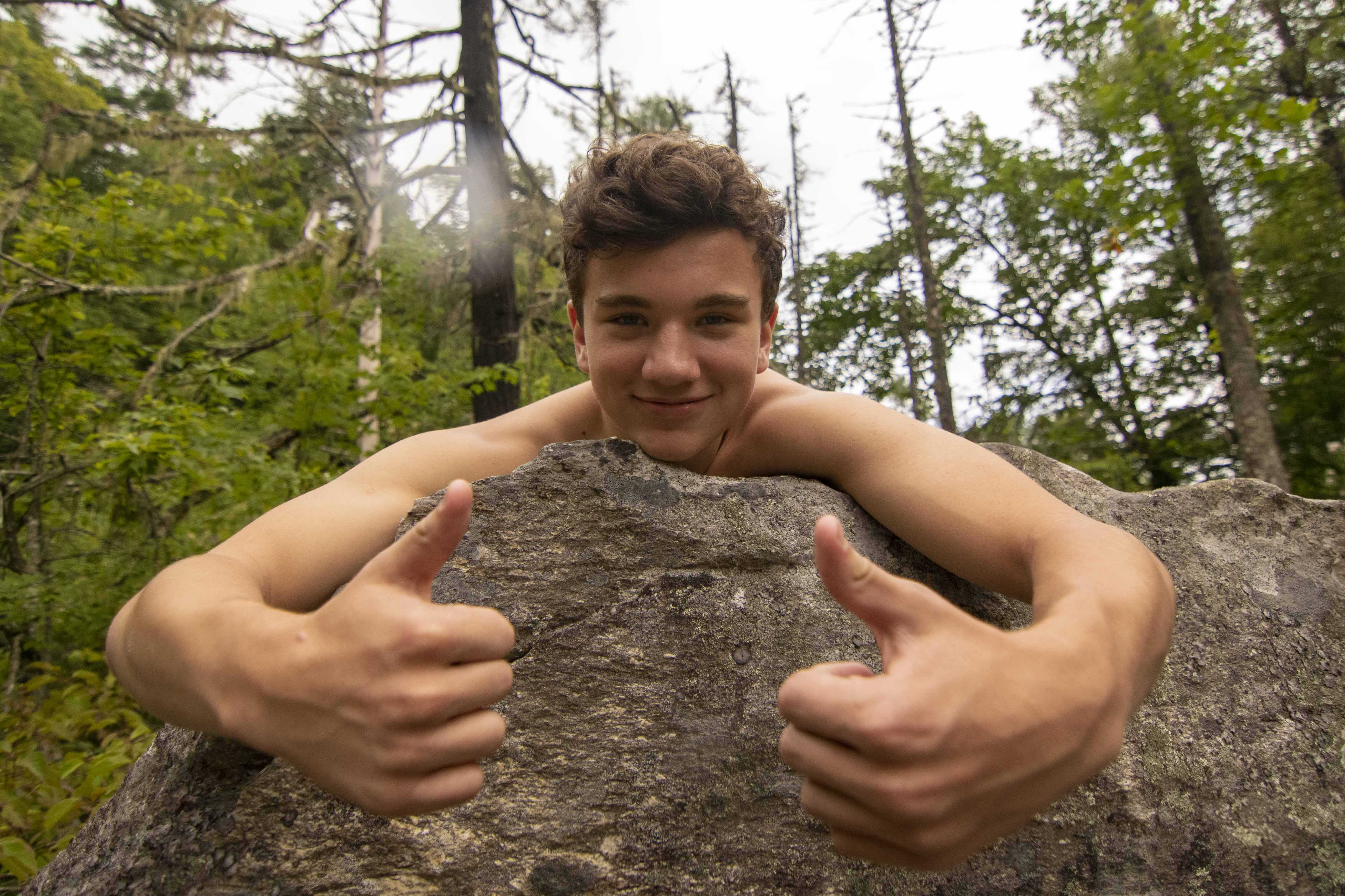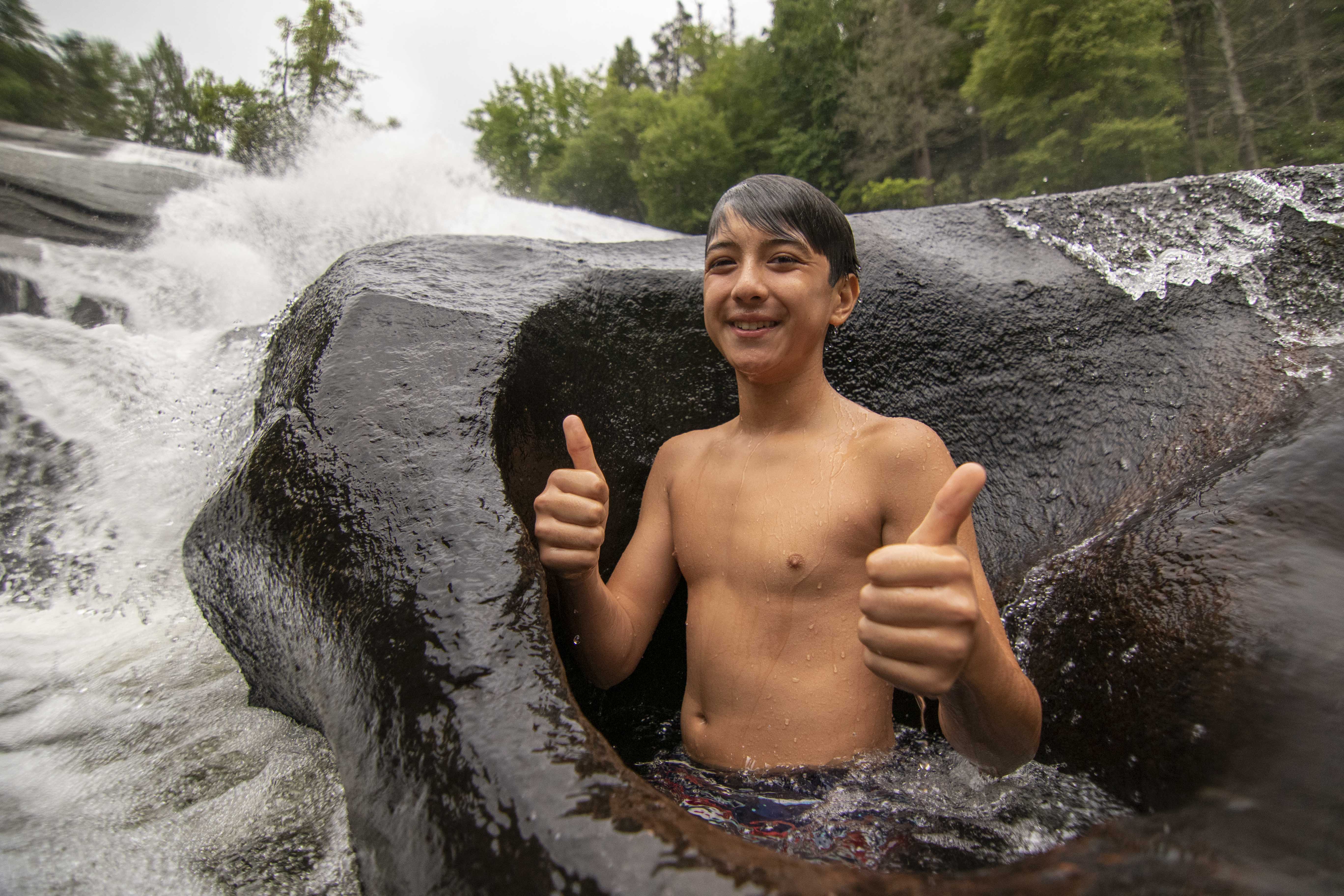 It happens all around camp, every day. We try new foods at meals, taking a tiny portion of an unfamiliar dish or carefully selecting a singular brussel sprout. We zoom off the zipline for the first time. We get blindfolded during Low Ropes and make our way through the woods. We perform in the Variety Show or at Coffee House, taking the stage for what may be the first time. And on Campout, one group surpassed an easier hike in favor of a greater challenge: scaling the Balds with packs on. Today, in DuPont State Forest, campers had the opportunity to jump into a swimming hole at the base of High Falls. There were even a handful of campers that crawled under and into a hole(formed by many years of water flow) to pose for a fun photo-op. Consistent in each of these moments is the encouragement–every performer leaves the stage to enthusiastic cheers, Low Ropes participants keep one another motivated, and the Campout group helped one another up Lower Bald with enthusiastic cheers and applause. For many campers, GRP is the place to try something new because they know they’ll have plenty of help along the way.