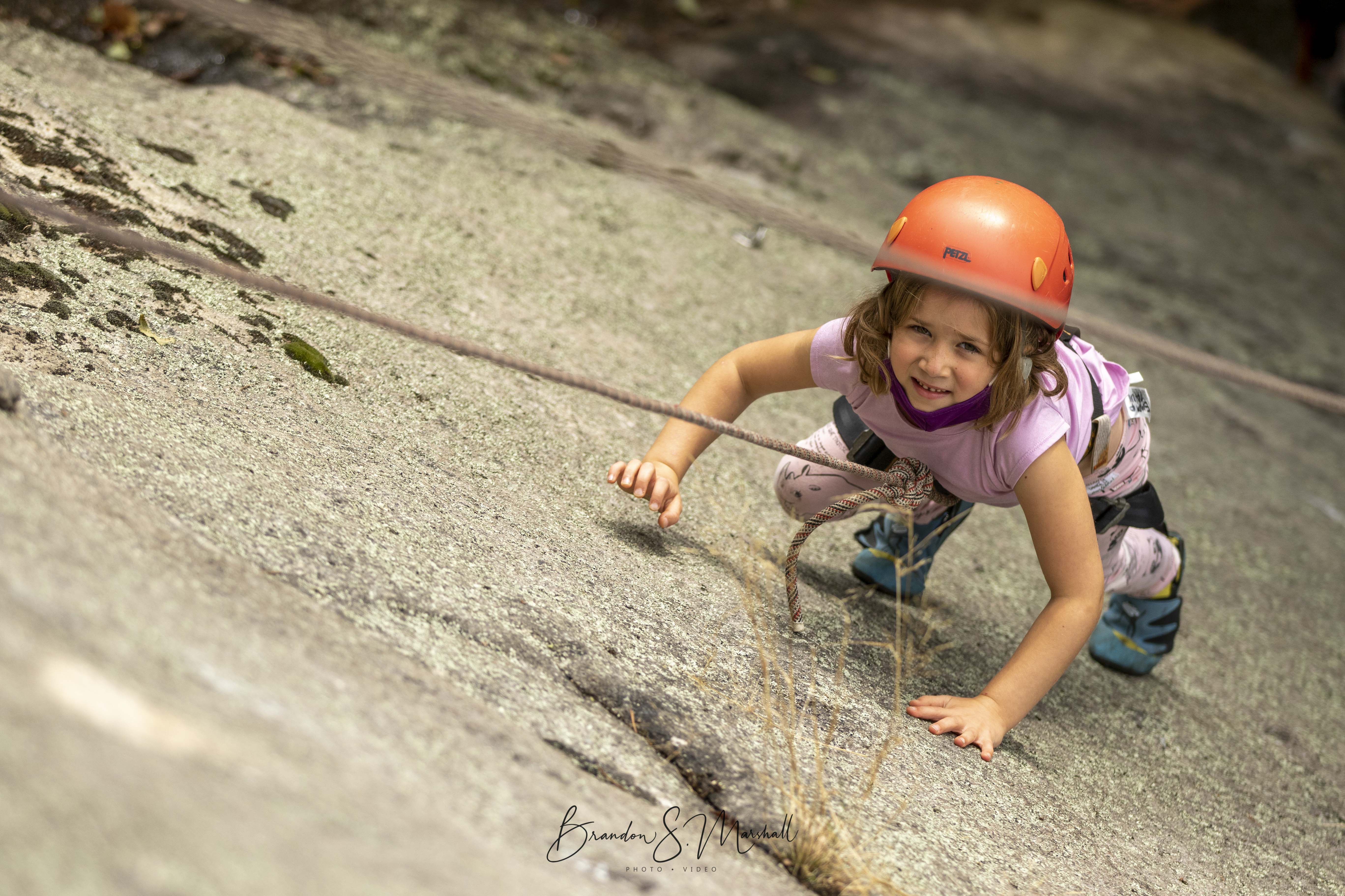At the base of Bear Rock, we got settled, put on our helmets, harnesses, and climbing shoes, went over the basics and started climbing. Lucy felt scared to start, she said, but as soon as she was tied into the rope and on-belay, she said she no longer felt afraid. The first time, Lucy only went part of the way up the wall, but once she got going, she didn’t look back (down). Lucy says her “daddy was an ok belayer, but that Danny is my favorite.” Indraa and Nabha were eager climbers, too, and even convinced their dad to try.