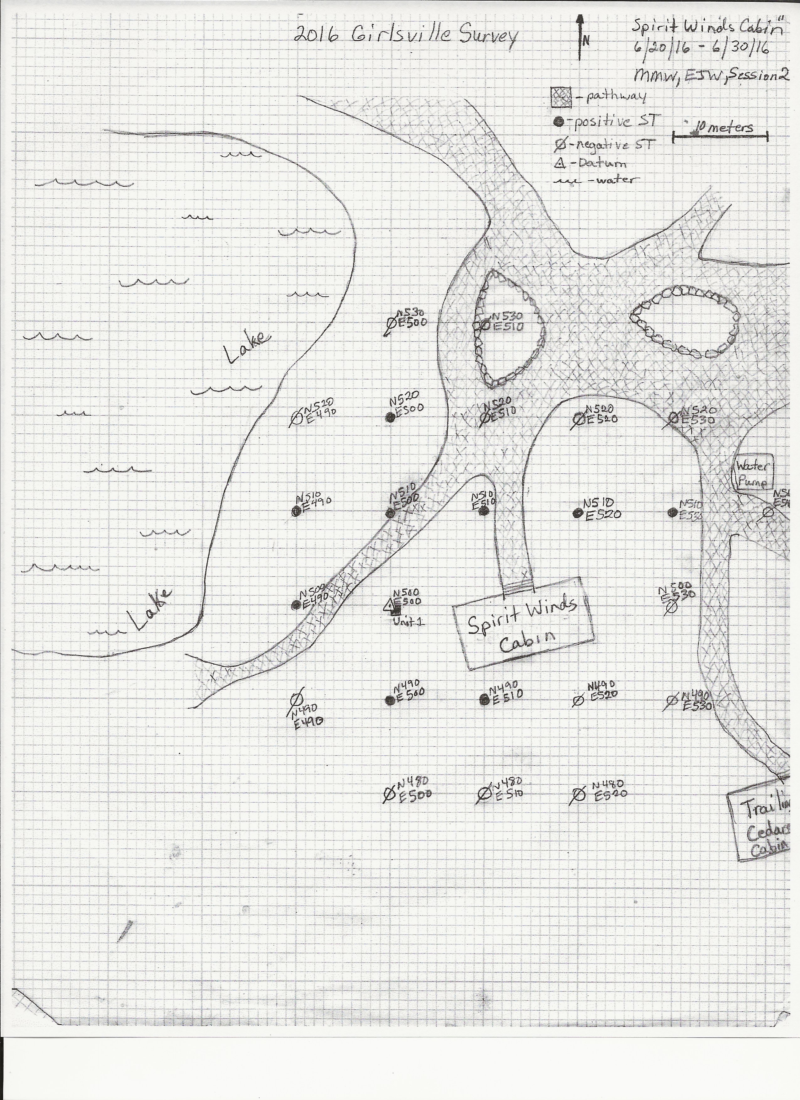 With help from the campers of session 2 in 2016, we completed the Phase I shovel test survey around the Girlsville cabins. The datum (a point that serves as the measurement and reference point for both vertical and horizontal measurements) was defined as ST3 from 2012. Artifacts were collected from the positive shovel tests and we were able to draw an amazing site map including the datum, positive and negative shovel tests, Test Unit 1, cabins, pathways, the lake, water pump station, a directional arrow, and a distance chart.