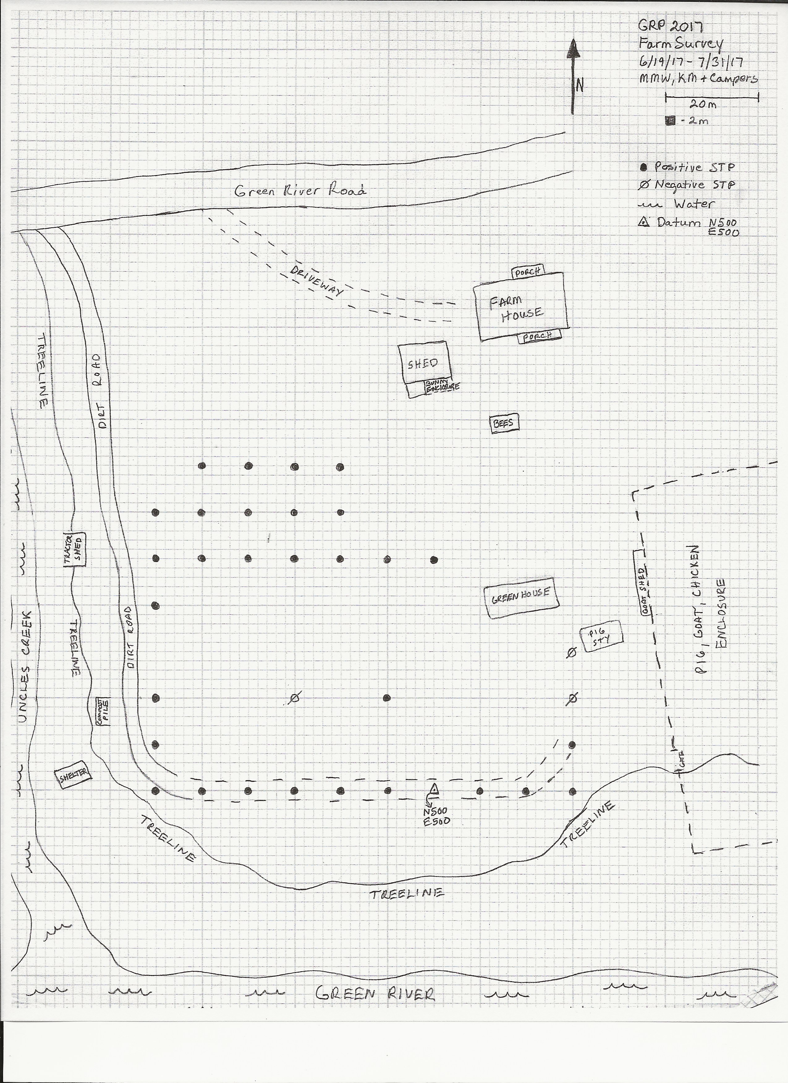 Working with the campers in the summer of 2017, I began a Phase I shovel test survey at the GRP farm and started a site map of the area. 32 out of the 35 shovel tests contained artifacts. Several of the shovel tests had evidence of charcoal, rocks and other features such as post holes. Future excavations will reveal the Native American camp sites and villages at the GRP Farm and east along the Green River.