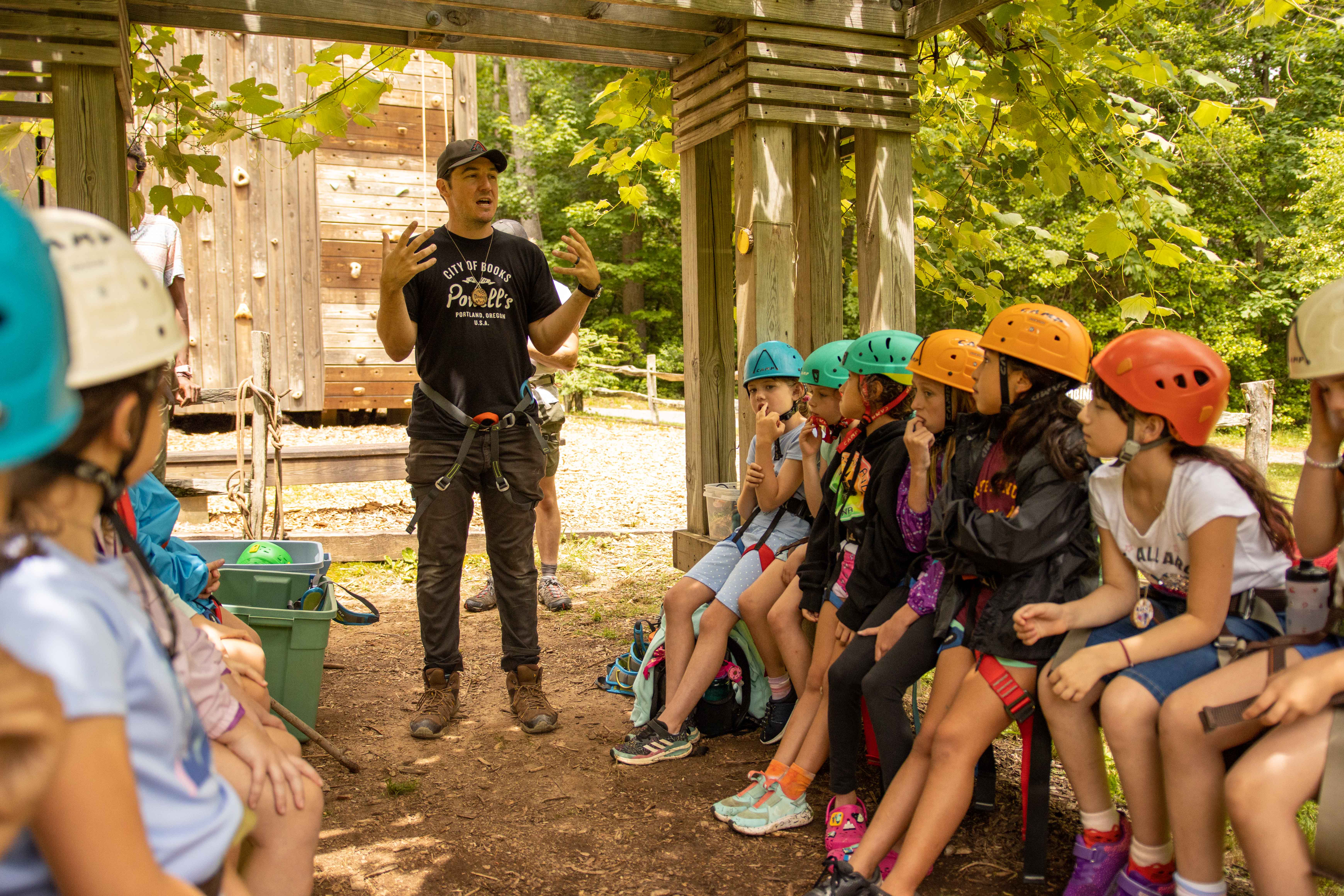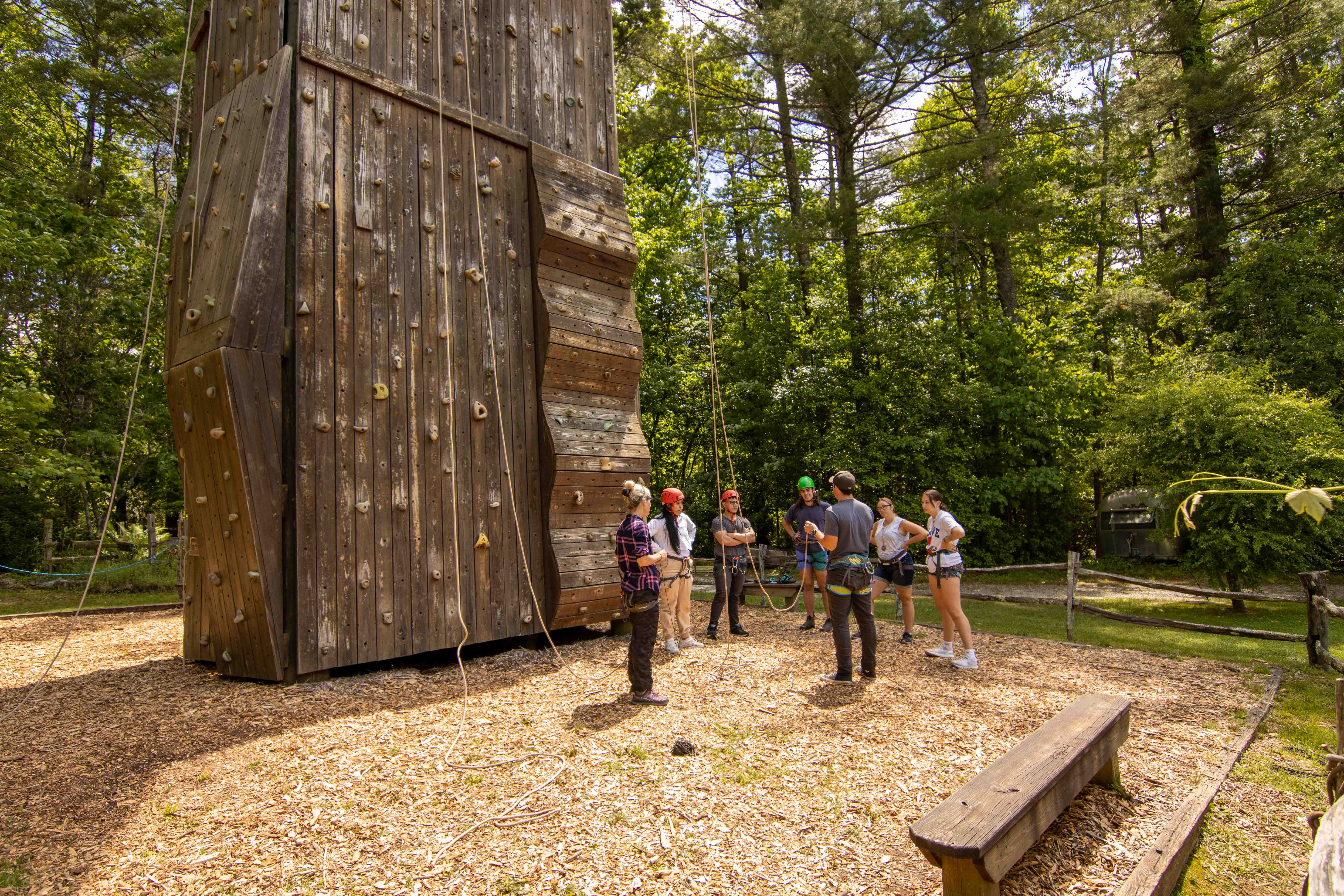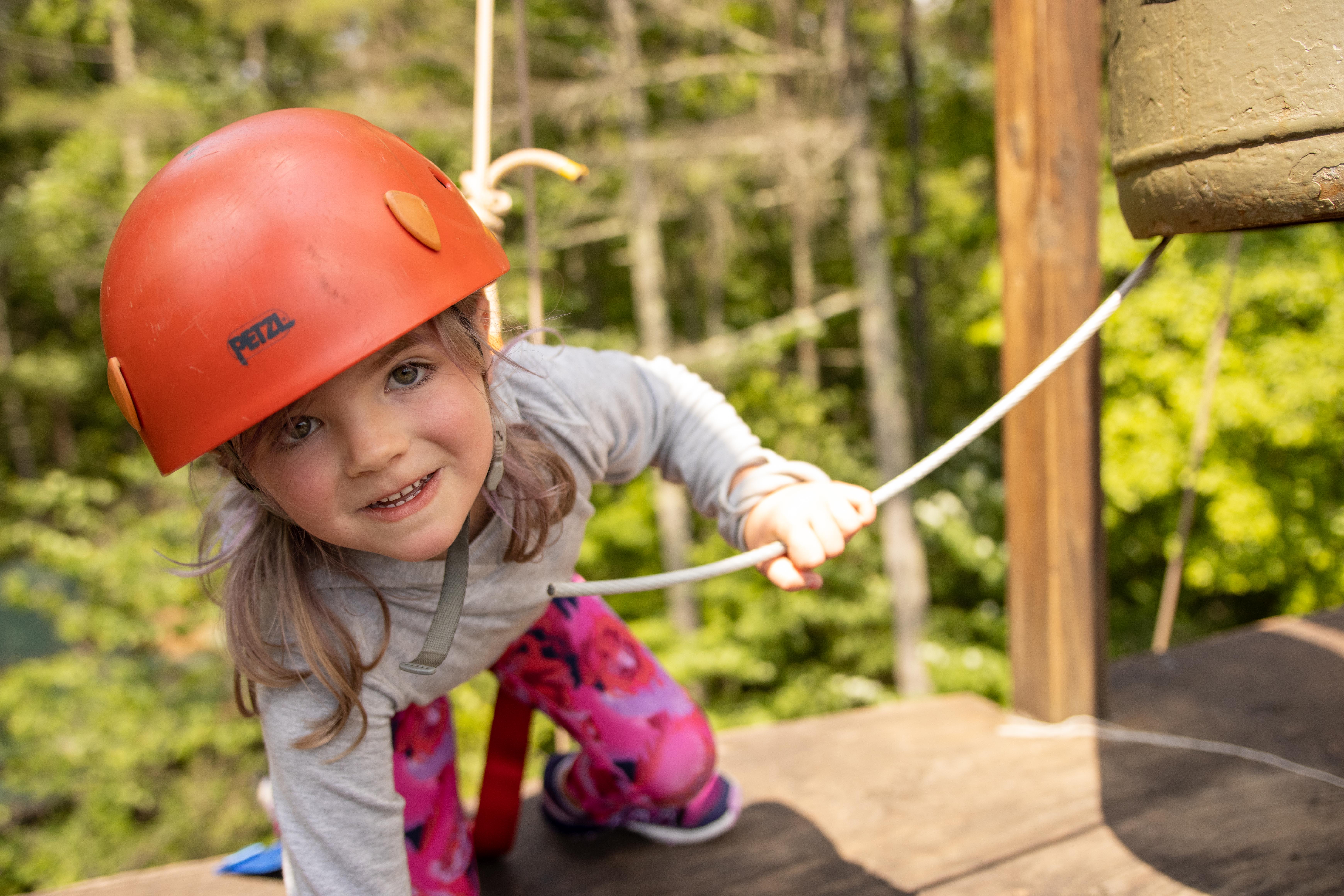 Once each child had a harness and a helmet that had been secured by a trained staff member, it was finally time! The children walked excitedly around the climbing wall, deciding which side to challenge first. Lines of children formed on the benches as they watched the staff members carefully secure gear as their fellow campers began to climb. With each level of climbing experience came a different level of nervousness for each individual camper. Some campers went up one single time and proudly rang the bell before returning to the ground to cheer on their fellow campers. Some of the climbers quickly adapted to the challenge and attempted to climb each face of the wall. However, some campers created personal goals of climbing partway up the wall and struggled to tackle their fear of falling. These children were encouraged by staff members to practice leaning onto the rope so that they could feel the security in their harnesses. The campers that stated that they wanted to come down were met with an open question of, “Would you like to try one more step?” The children were supported, encouraged, and praised whether they reached the top, or they only took three steps.
