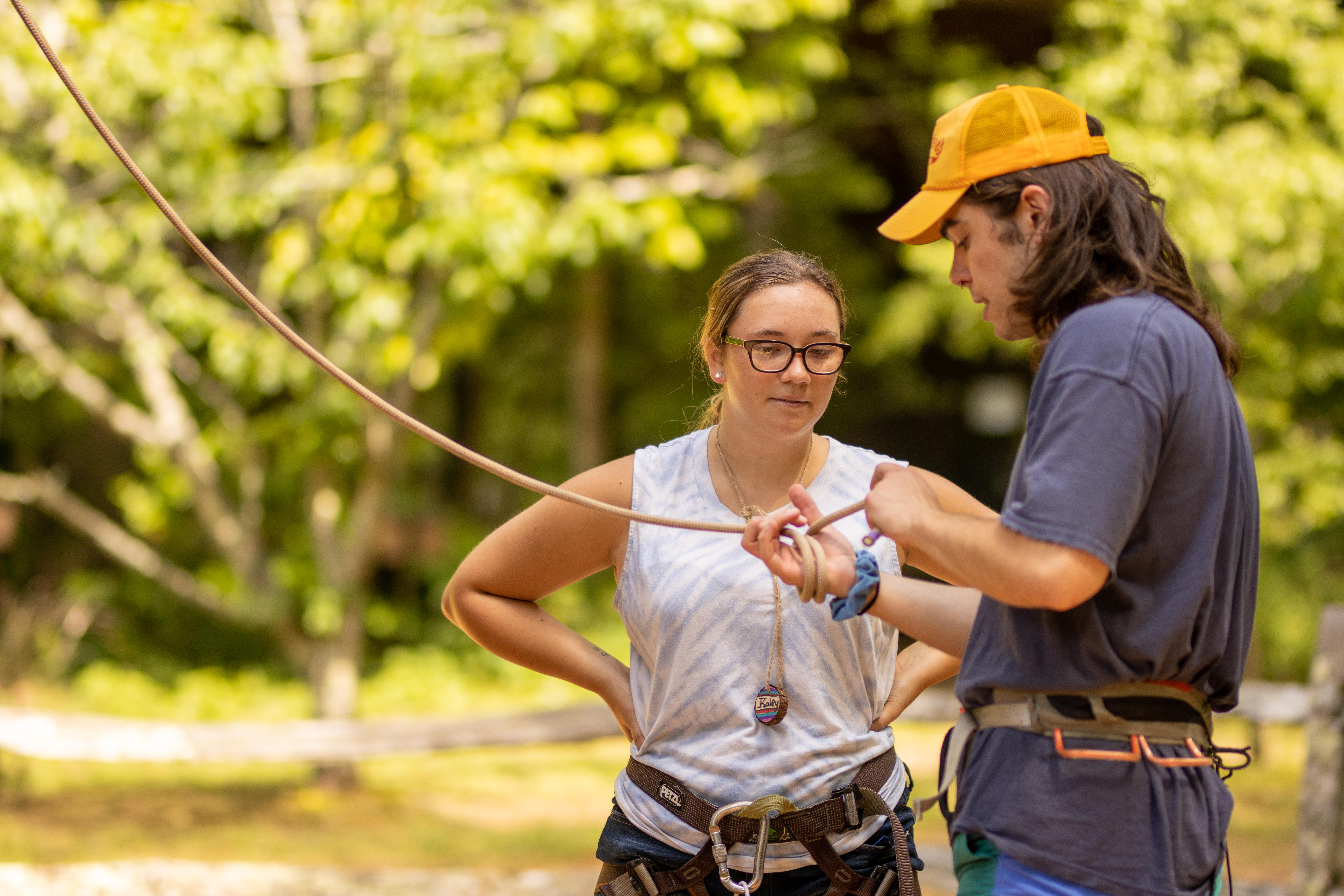 On Tuesday afternoon, campers experienced their second day of a wide-range of activities which included the Climbing Tower. With a variety of experience levels, some campers had braved climbing walls before, but most of the children had either very little or no experience. Despite the differing levels of experience, it was clear that the majority of the children were ecstatic with anticipation. Most children listened with bright smiles and eager faces as the activity leader, Danny, discussed the safety gear and rules. Danny instructed the campers on how to put on the climbing harness starting with, “Then you put the belay loop over your belay-button!” To Danny’s surprise, the staff found this joke much funnier than the children did. While the children may not have appreciated Danny’s joke, they did enjoy his method of testing the security of helmets. This method included the children throwing up a ‘rock and roll’ sign and shaking their heads, proving that the helmet is safely secured.