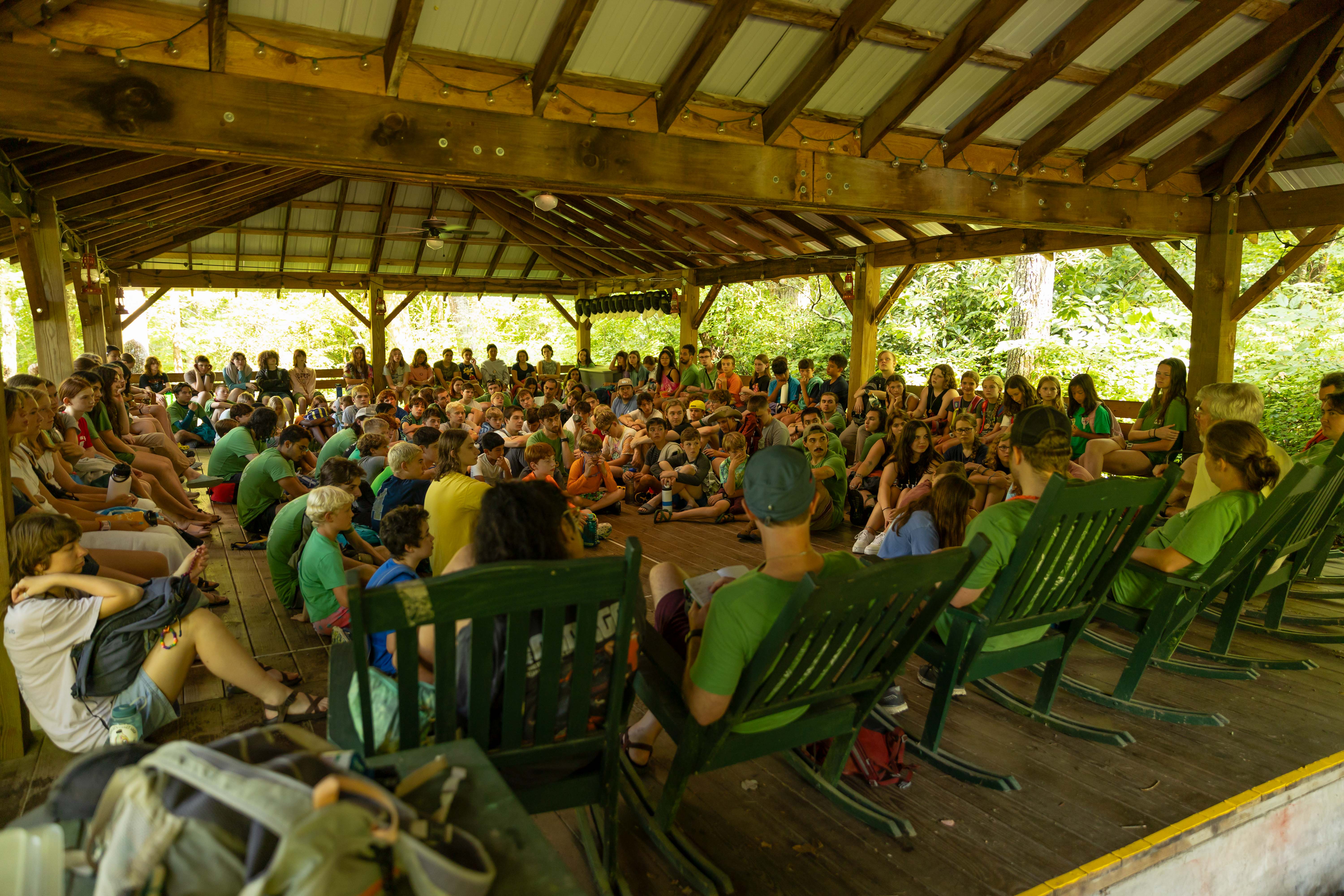 Under the pines, a rushing wind swirled over the mountaintops - sitting down under the roof of our gazebo as the rain pelted down above, campers and staff alike sang the storm in at the top of their lungs and laughed along with the thunder. The rain played out a brilliant percussion as our staff (and eventually, camper!) band, The Green River Ramblers, lead the camp in songs that many of our returning campers know by heart, and the cheer for an encore could be heard around basecamp through the rain.