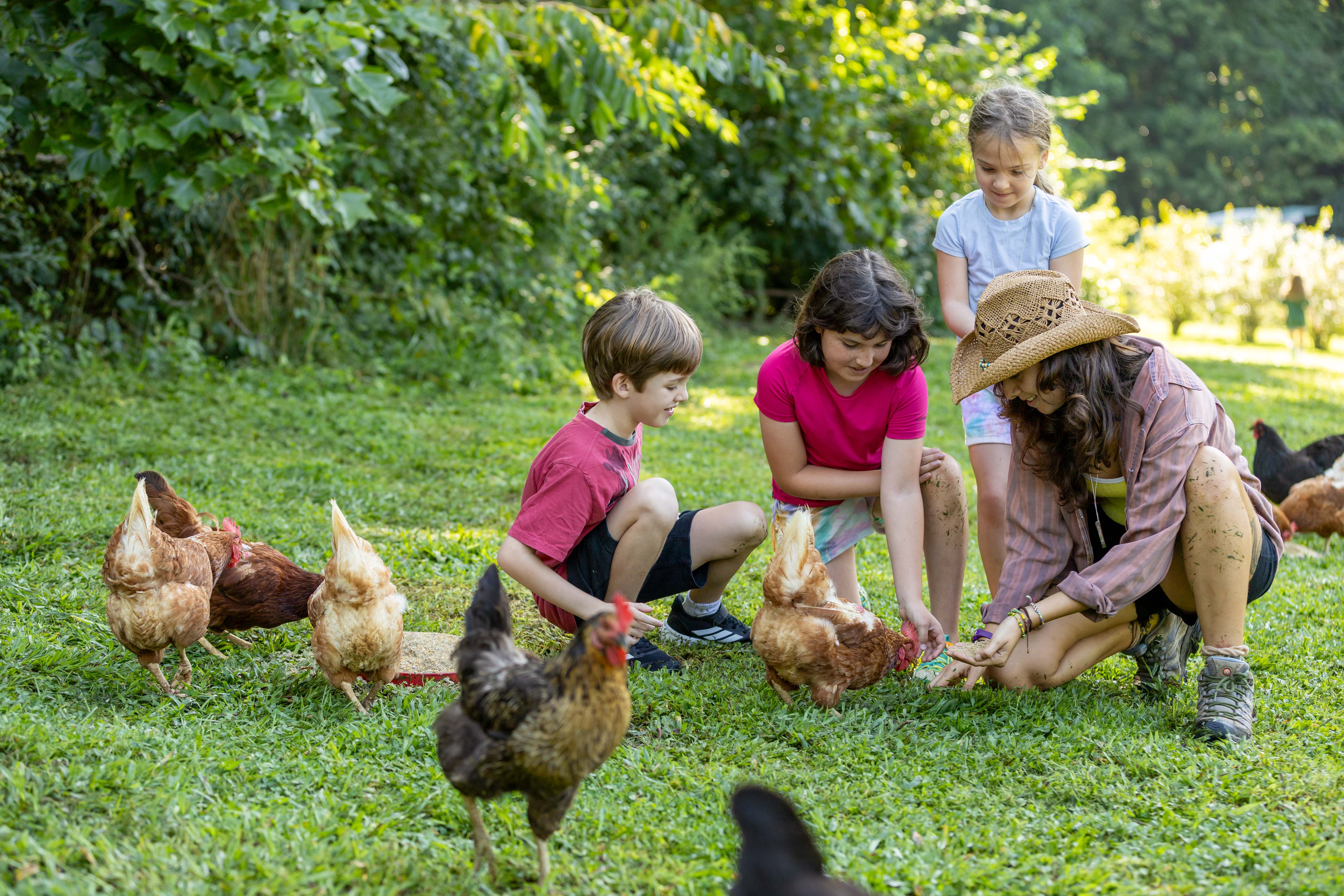 Our barnyard is home to chickens and runner ducks eager for gentle hands, three playful pigs, and our long-time residents Elvis Pigsley and Kevin Bacon, who prefer napping under the shade. Goat pens invite head scratches and friendly headbutts, while a couple of sweet farm cats prowl the fences. This season even brought a nest of four baby birds, growing stronger by the day—a perfect mirror of the campers who arrive hesitant and leave brimming with confidence.