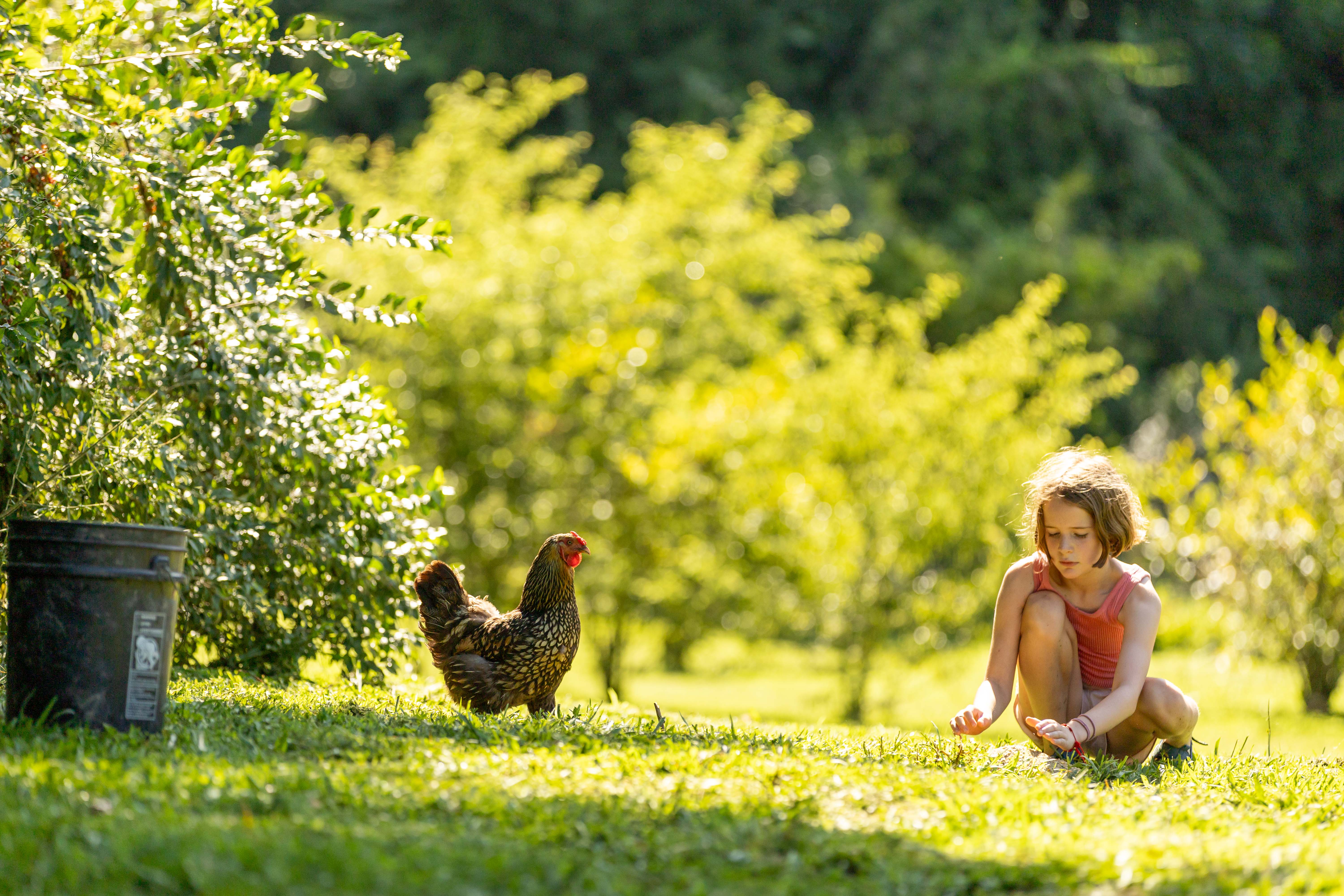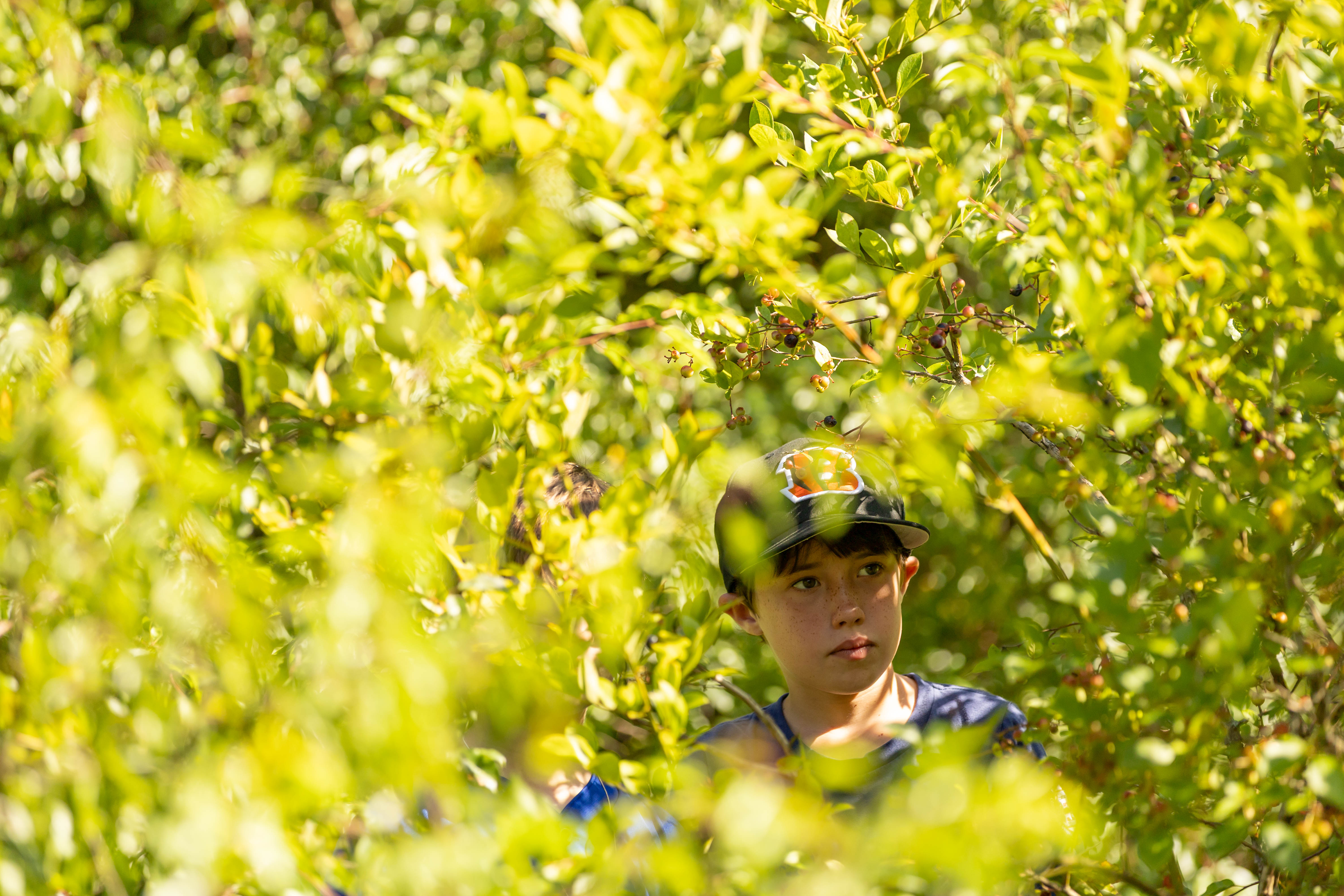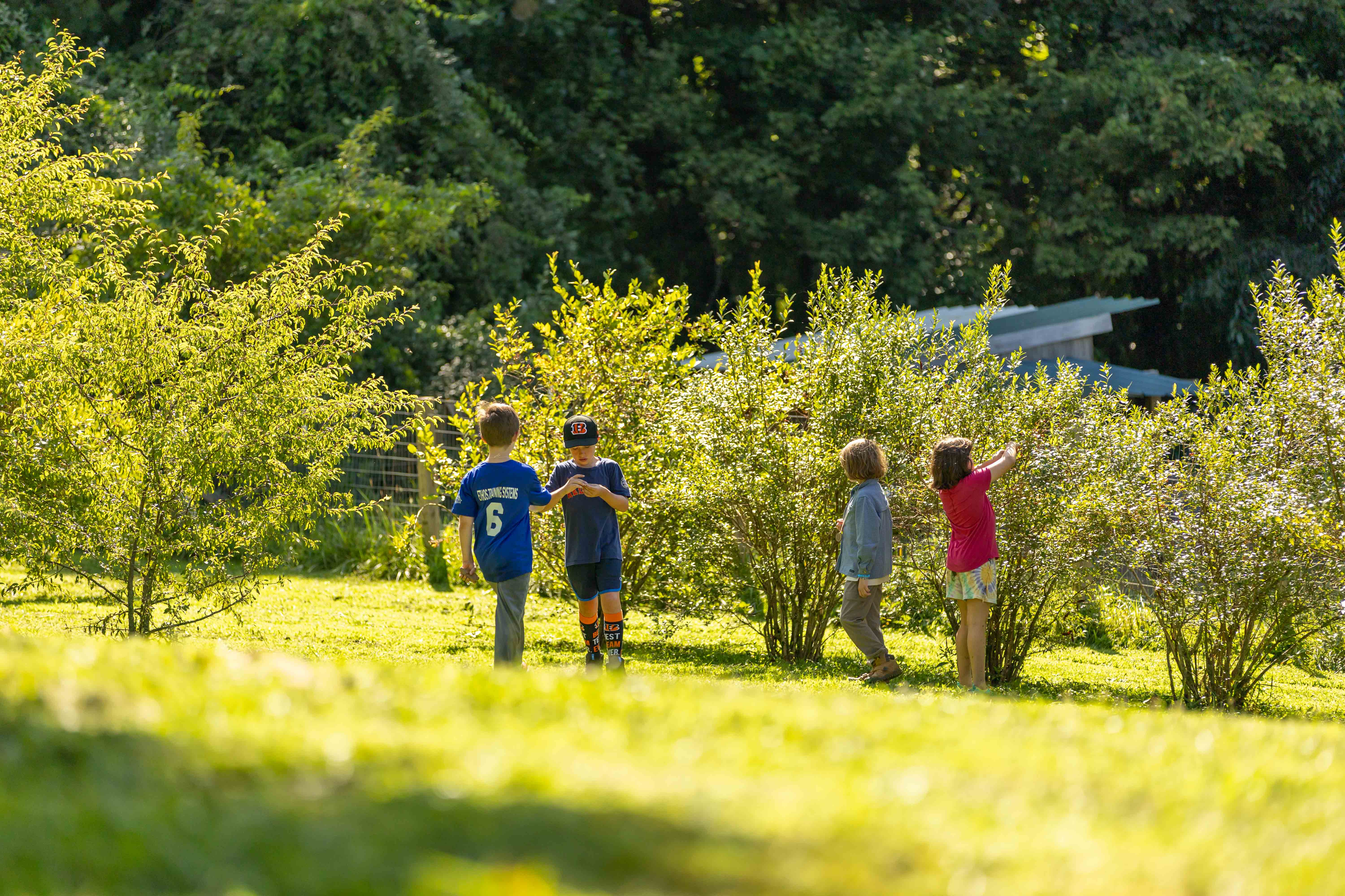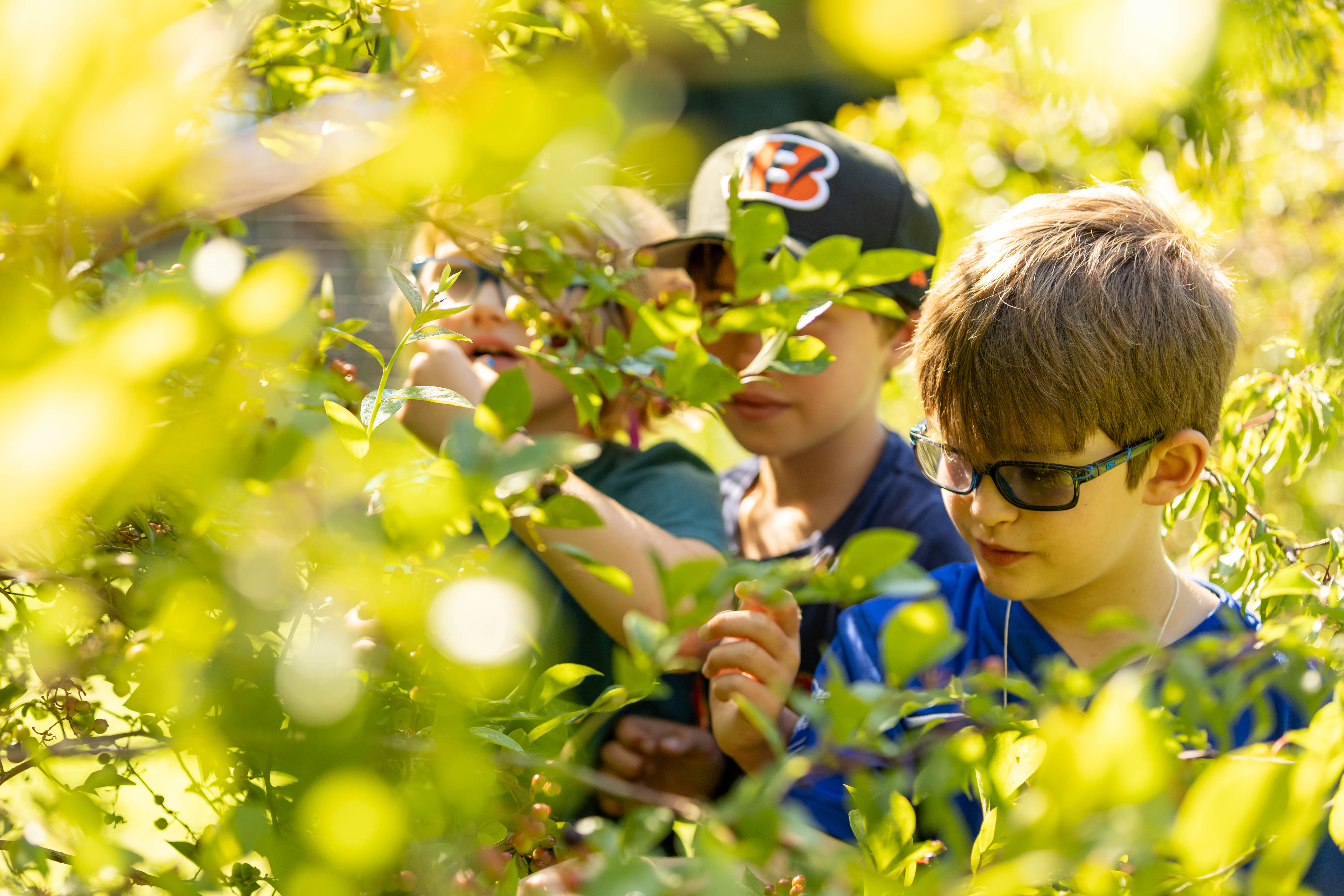 Each Mentor Hike to the farm reveals something new. In the herb garden, Campers inhale the scent of oregano and thyme before sampling green beans and “wizard fingers.” They peer into Cobba the Hut, our handcrafted pizza oven nestled among hundreds of white bees, then wind through rows of apple trees, blueberries—especially our signature pink lemonade blueberries—and a lush orchard. In warm months, buzzing honey bees and other insects illustrate the vital role pollinators play in our ecosystem.
